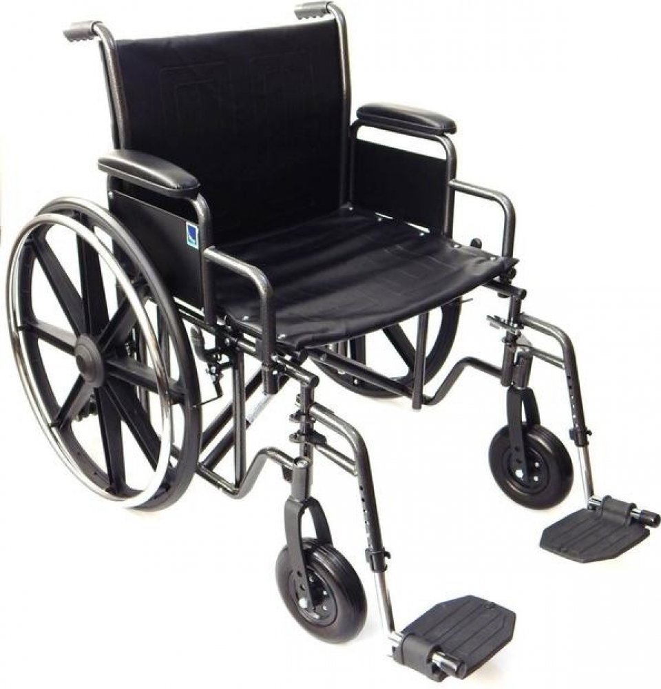 Invalidní vozík mechanický s ocelovým skládacím (křížovým) rámem se zvýšenou nosností 225 kg a šířkou sedáku 56 cm a plnými koly.