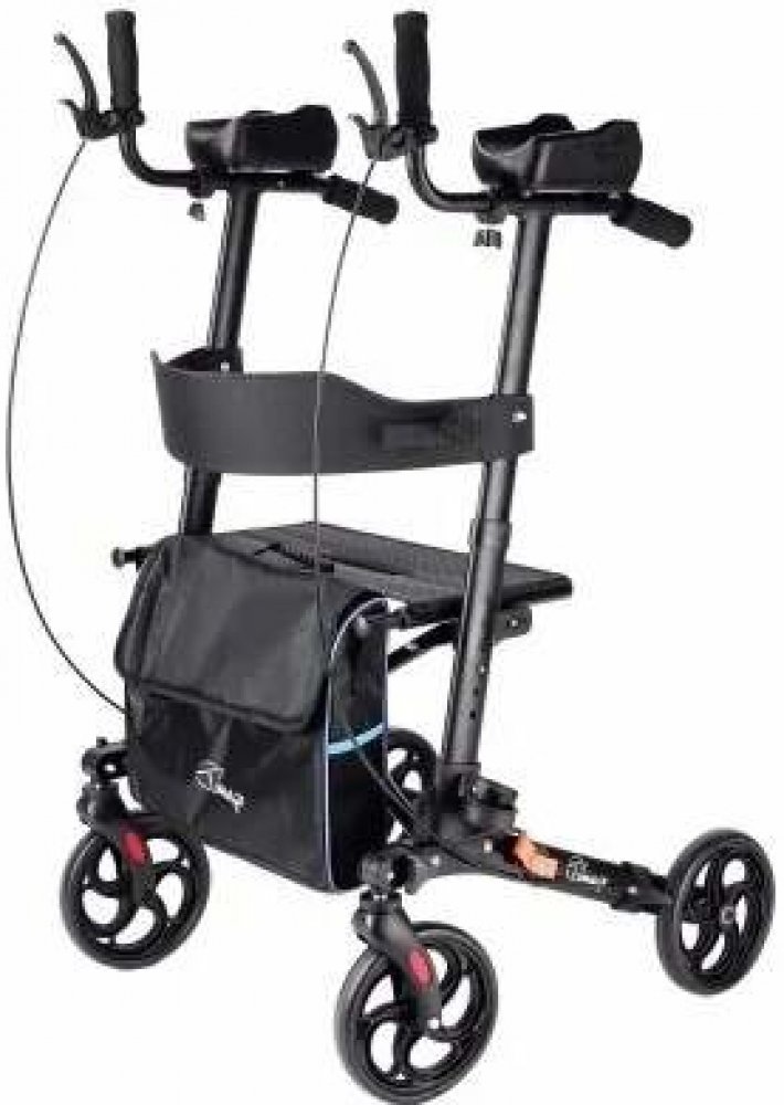 4-kolové chodítko je vyrobeno z práškově lakovaného hliníkového rámu.Je vybavena brzdami s aretačním mechanismem, sedadlem, držákem hole a taškou.Chodítko má výškově nastavitelné rukojeti, loketní opěrky a pevná 8” (20,3cm) kola.