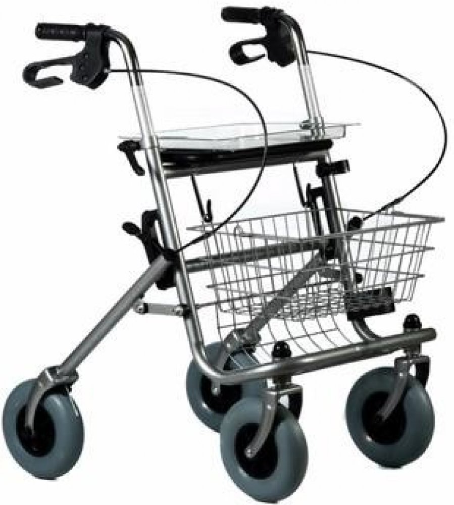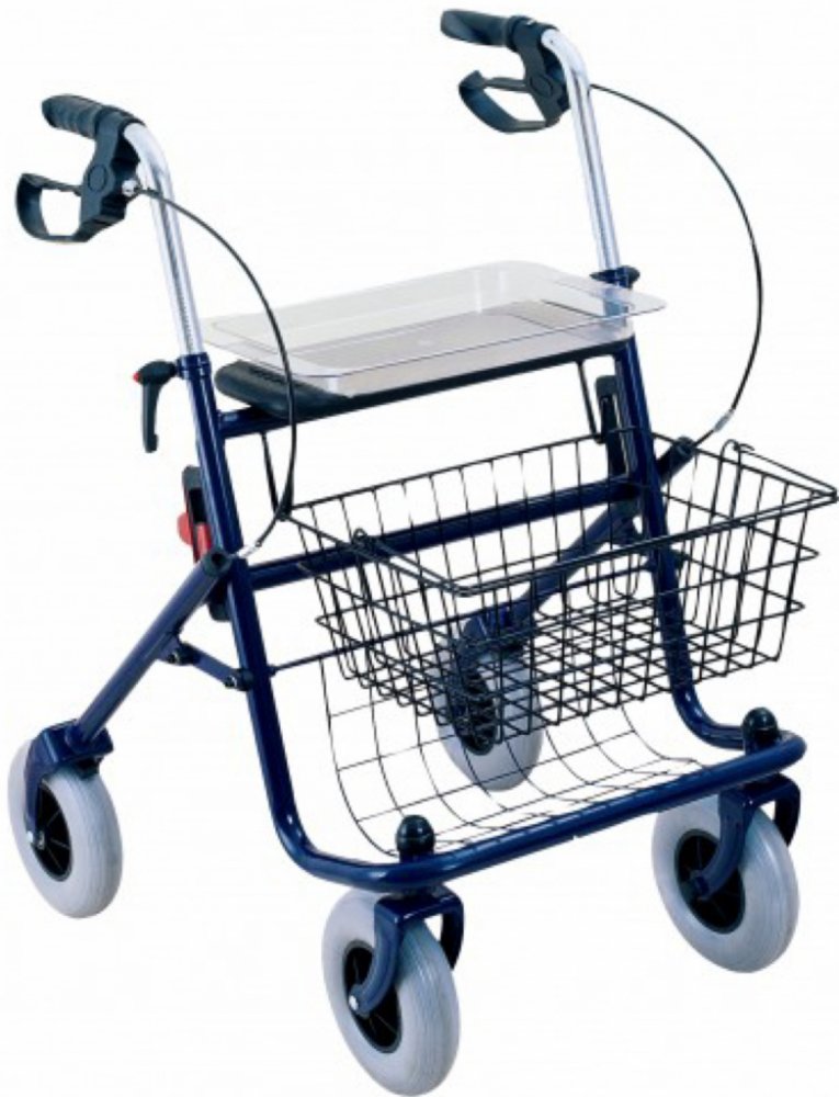 Skládací ocelové s nastavitelnou výškou, sedátkem a košíkem Rám ocelový skládací.Pohodlná madla anatomicky tvarovaná.Odnímatelný košík, sedátko a tác ve standardní výbavě.Kola plná průměr 20cmBrzdění v parkovací poloze.Držák na hůl/berli.Barva modrá.