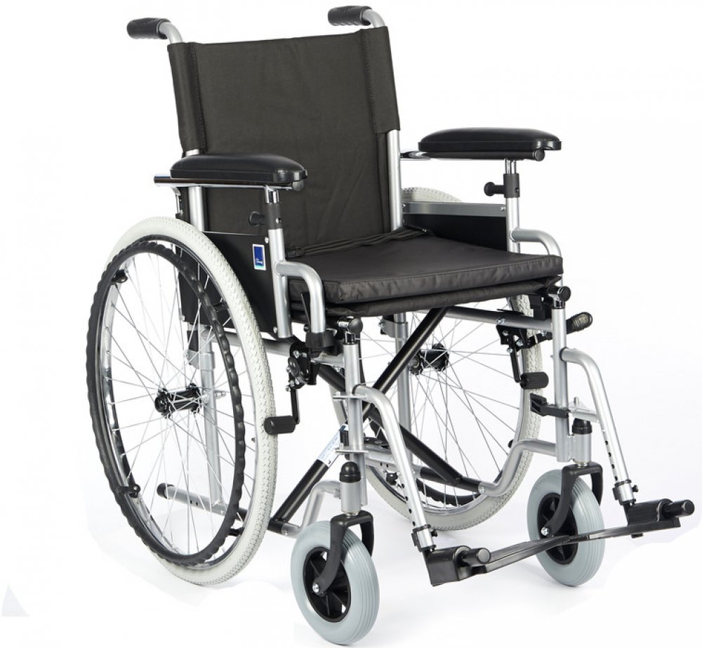 Invalidní vozík mechanický s ocelovým skládacím (křížovým) rámem se zvýšenou nosností 135 kg a šířkou sedáku 51 cm, plnými koly (nehustí se), funkcí rychlé demontáže kol a popruhem k fixaci pacienta.