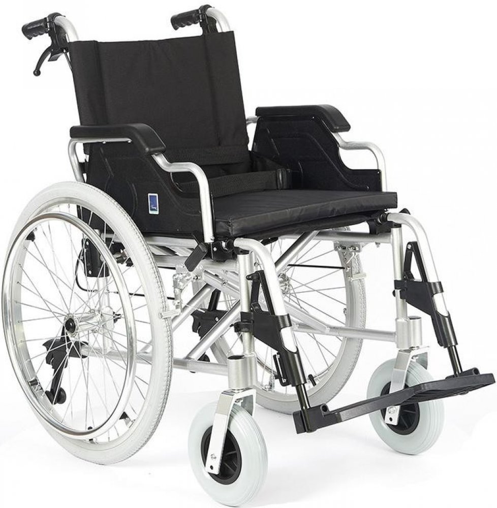 s rychlospojkou a brzdou 51cm Invalidní vozík mechanický s odlehčeným duralovým skládacím rámem (dvojitý křiž), s pomocnou brzdou pro doprovodnou osobu, nastavením těžiště, kolečky proti převržení dozadu. Je možno dokoupit zvlášť měkký podsedák (TIM-S). Široký sedák 50 cm a zvýšená nosnost na 120 kg. Vnitřní šířka 51 cm Rám duralový, skládací (dvojitý křižák). Sedadlo černé, nylonové s příměsí bavlny (podsedák zobrazený na obrázku není součástí dodávky a je možno jej zakoupit zvlášť (TIM-S) Nastavení těžiště na předních kolech (pro pacienty po amputacích dolních končetin). Stabilizační kolečka proti překlopení vozíku dozadu - výškově nastavitelné/demontovatelné. Loketní opěrky krátké, odklopné. Zadní kola pneumatická 22" s funkcí rychlé demontáže kol (rychlospojka). Parkovací brzdy. Pomocné brzdy pro doprovod. Přední kola plná 8" Stupačky odklopitelné a odnímatelné. Břišní upínací pás. Lýtkový pás. Podrobné technické údaje naleznete ve vedlejší záložce Specifikace