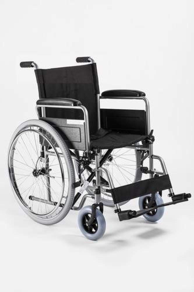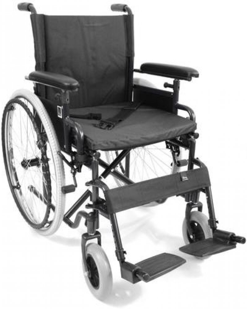 Invalidní vozík mechanický s ocelovým skládacím (křížovým) rámem se zvýšenou nosností 135 kg a šířkou sedáku 51 cm, plnými koly (nehustí se), funkcí rychlé demontáže kol a popruhem k fixaci pacienta.