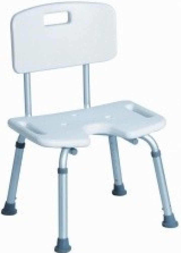 Výškově nastavitelná stolička do sprchy, plastové sedátko s hygienickým výřezem, plastová opěrka zad.