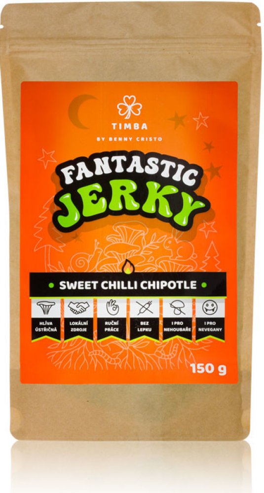 Hlíva ústřičná (na 100 g jerky použito 380 g hlívy), třtinový cukr (min 15%), paprika kapie, kikkoman sójová omáčka (voda, sójové boby, sůl, ocet kvasný lihový), bio kokosový olej, citronová šťáva, cibule, světlá miso pasta (voda, sójové boby, rýže, sůl), bio javorový sirup, bakticid (maltodex- trin, extrakty cibule), zázvor, kukuřičný škrob, sušený česnek, himálajská růžová jedlá sůl, sušená cibule, chilli Chipotle 0,3 %.