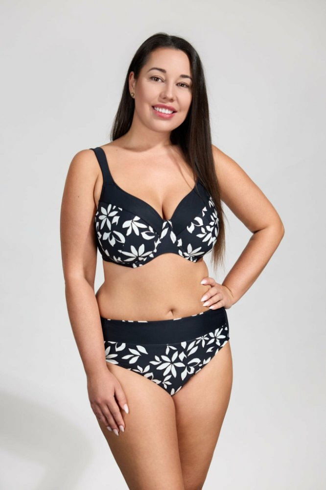 Podprsenka je podložená ve všech třech dílech, aby nedocházelo k povolení materiálu ani po namočení. Vysoké sedlo zajišťuje pevný obvod a rovnoměrné rozložení váhy prsou.