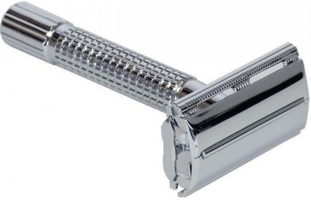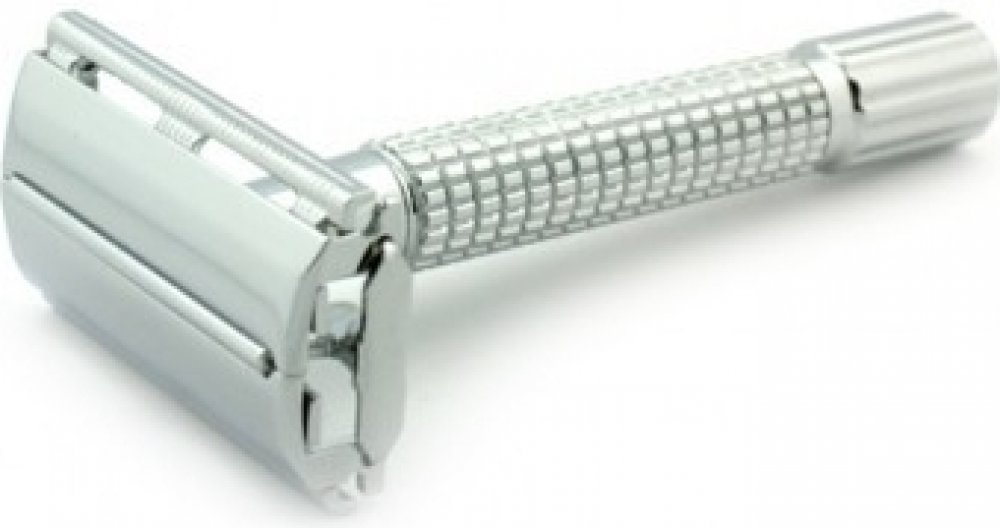 Kvalitní holicí strojek Timor v lesklé povrchové úpravě a s hlavicí typu butterfly - hlavice se šroubováním rozevírá a tím umožňuje bezpečnou a rychlou výměnu žiletek.