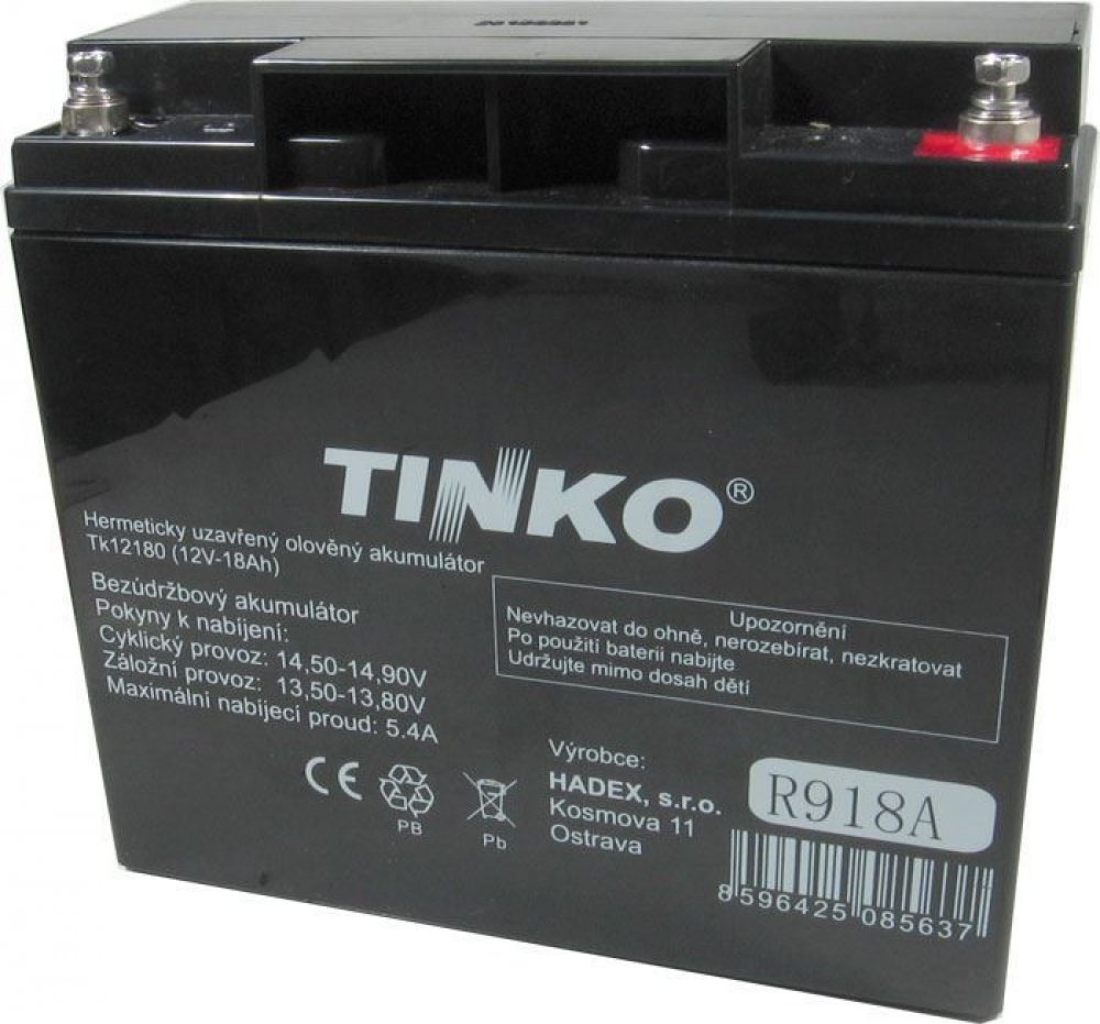 Pb akumulátor TINKO VRLA AGM 12V/18Ah rozměry 180x74x164mm/5,81kg,vyrobena technologií VRLA AGM (Absorbed Glass Mat),hermeticky uzavřená,bezúdržbová. Terminál F3 - pro očka 6,5mm