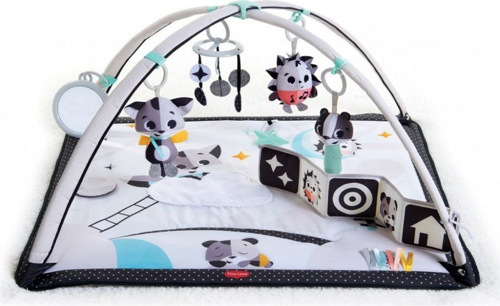 Velká hrací plocha umožňuje dítěti natáhnout své tělo, experimentovat s pohybem a rotací, zatímco chroustavý polštář, zrcadlo a & nbsp; ježek s melodií & nbsp; děťátku umožňují prodloužit čas strávený na břiše.