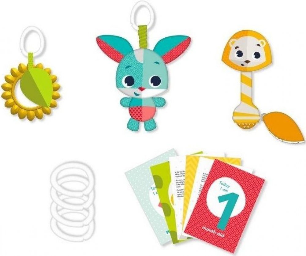 Vlastnosti: - v sadě najdete obsahuje tři závěsné hračky (slunečnici, vibrujícího králíčka a chrastítko v podobě lva), 4 závěsné propojitelné kroužky a 12 očíslovaných karet pro zaznamenání růstu dítěte během prvního roku - hračky pomáhají rozvíjet kognitivní vývoj a jednotlivé smysly dítěte - vhodné pro děti od narození