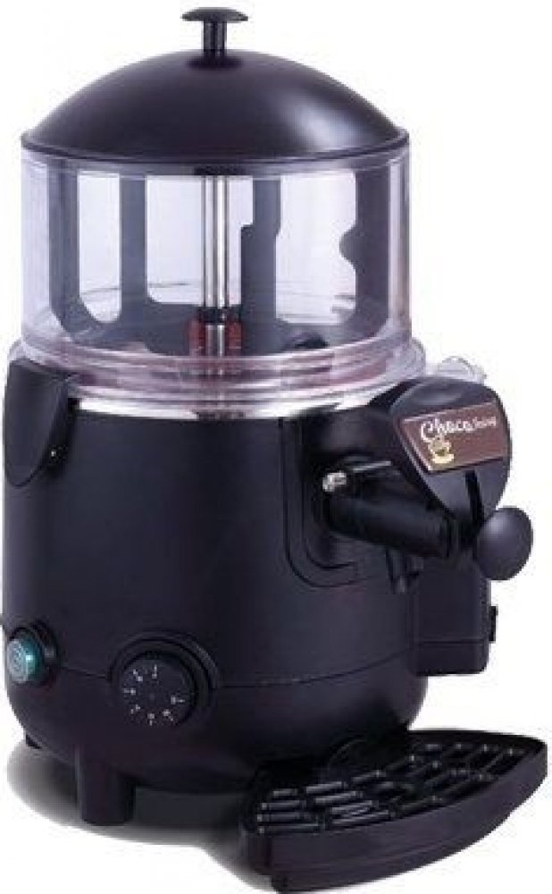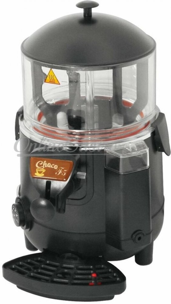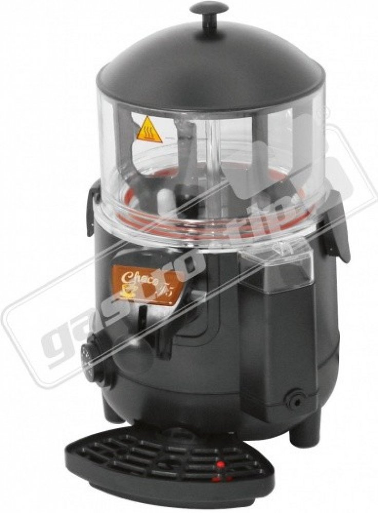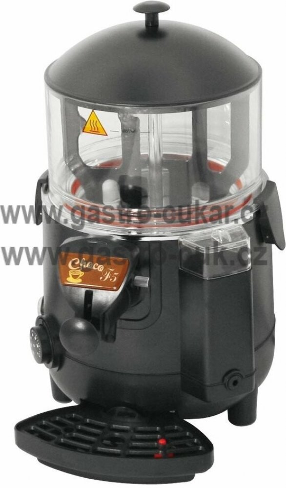 Výrobník horké čokolády CHOCO F-5 je koncipován na výrobu a prezentaci horké čokolády, ale i řady dalších horkých nápojů (káva, čaj, grog, punč, svařené víno atd.). Šetrný nepřímý systém ohřevu a udržení v teplém stavu (ohřev přes vodní lázeň-bain marie) s možností regulace teploty dle potřeby od +30 až do +100°C. Kontinuální rovnoměrné míchání (odolné míchací lopatky-vyjímatelné, hřídel vybavena silentblokem proti zanášení a namáhání) zamezuje tvorbě usazenin, sraženin a udržuje čokoládu v optimální konzistenci. Speciální konstrukce výpustného kohoutu zamezující ucpávání a umožňuje snadné čistění (kohout vybaven pákou snadného mechanického pročistění). Ohřev vody je prováděn v nerezovém duplikátoru (AISI 304), který je vybaven tepelnou ochranou. Snadno odnímatelná nádoba je vyrobena z odolného čirého polykarbonátu. Odkapová miska je vybavena plovákem indikujícím plný stav.