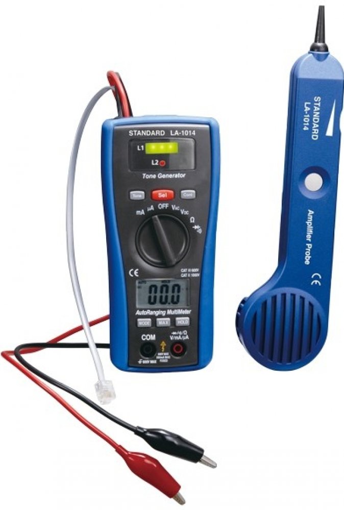 2 v 1 tester a multimetr patří mezi inovované testery, které umožňují snadné měření DC/AC napětí, proudu, odporu, diody a ověřuje nepřerušenost kabelu, rychle trasovat kabely nebo vodiče včetně svazků a také telefonních vedení. Jednoduše najdete vedení ve stěnách, stropech a podlahách. Skládá se z generátoru, který moduluje vysokofrekvenční signál na testovaném vedení a velice citlivého příjmače, který spolehlivě najde kabel ve zdi až do hloubky 15cm. Možnost připojení signálu přes krokosvorku nebo konektor RJ11. Co však tento přístroj vyvyšuje nad ostatní, je mnoho funkcí multimetru. Pro běžné měření tak již nepotřebujete další přístroj.