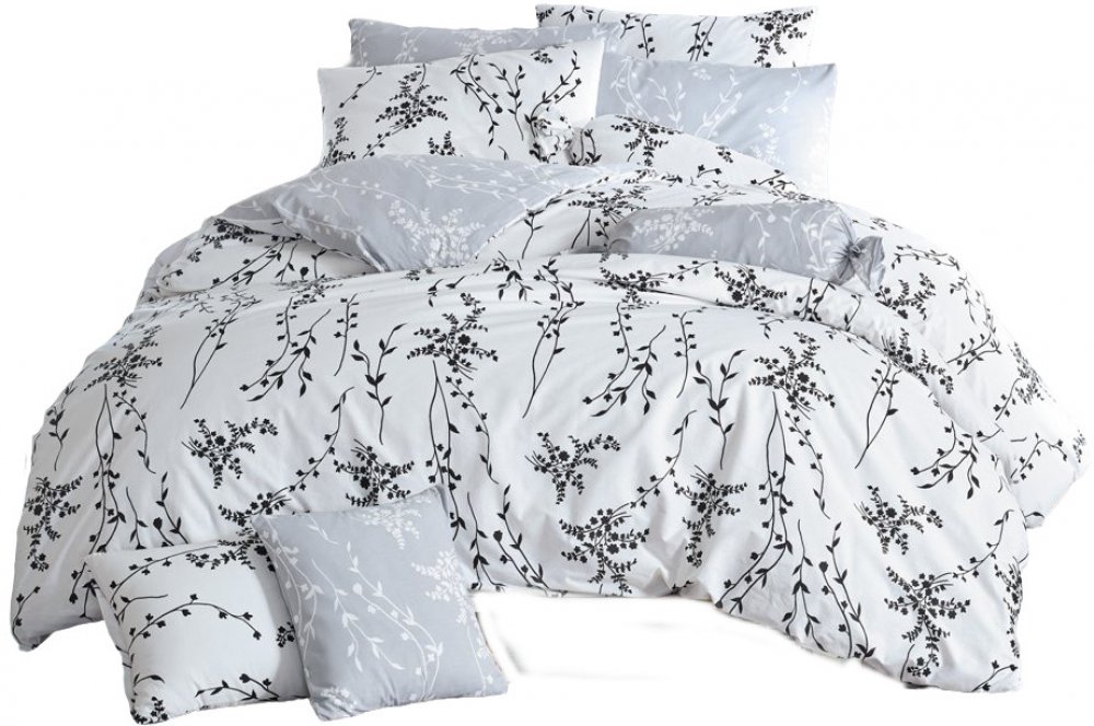 Bavlněné povlečení se vzorem listnatých větviček je oboustranné. Lícní strana povlaku přikrývky je bílé barvy s černým vzorem "větviček", na rozdíl od strany reverzní ta je šedé barvy s bílými "větvičkami". Vzor na povlaku přikrývky vede svisle, směrem dolu. Povlak polštáře je střižen se svi...