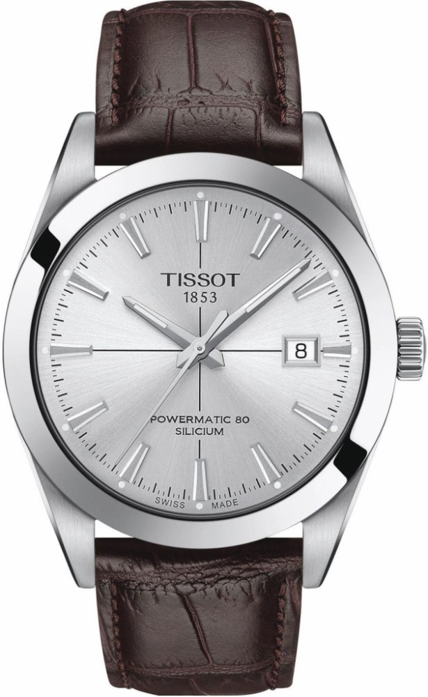 Pánské hodinky Tissot Gentleman Powermatic 80 Silicium s automatickým strojkem Powermatic 80.811, který nabízí až 80-ti hodinovou rezervu chodu, která se vám bude hodit zvlášť při střídání hodinek. Kvalitní pouzdro z ušlechtilé oceli má průměr 40 mm a skvěle ho doplňuje hnědý kožený pásek. Číselník s datem je chráněn safírovým sklíčkem s antireflexní vrstvou.