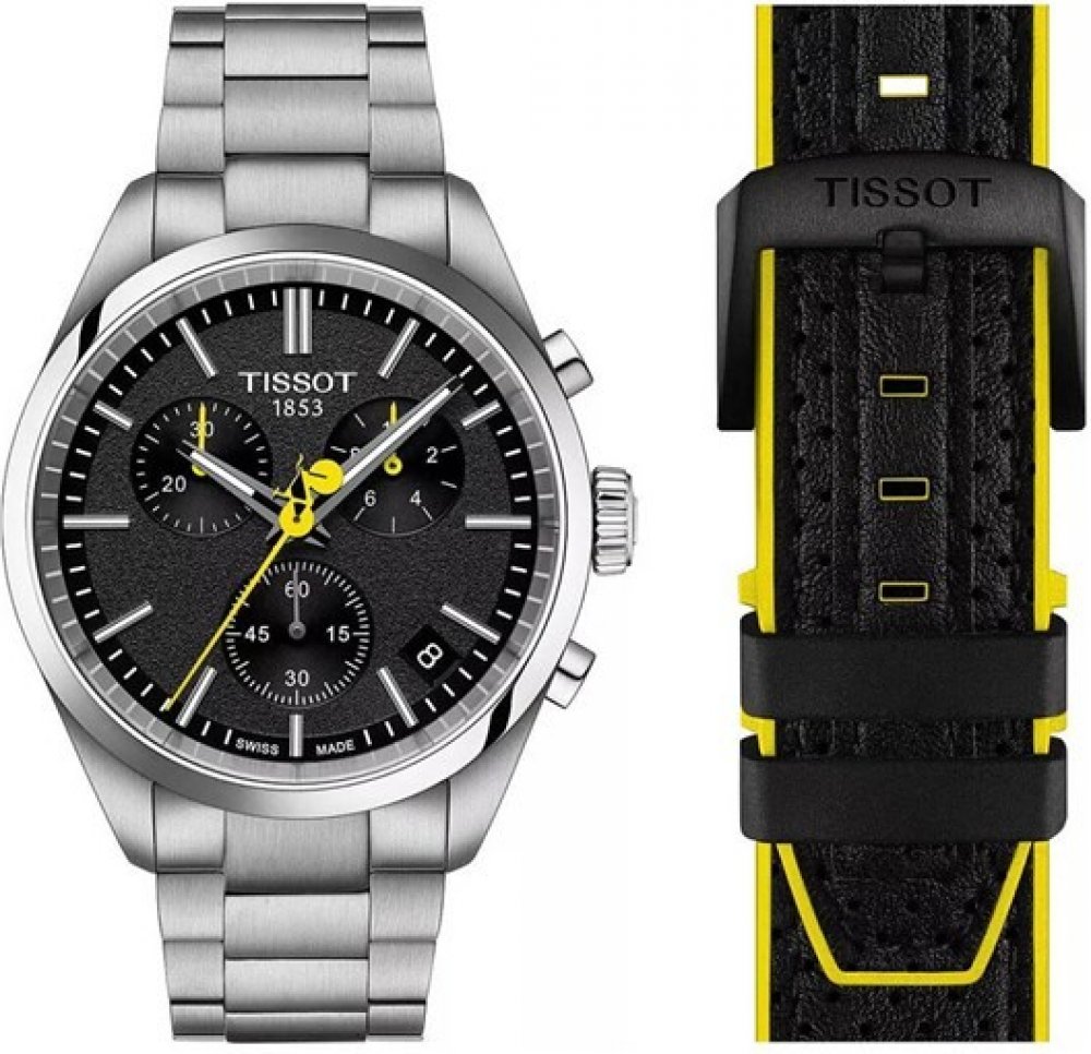 Všestrannost modelu PR100 je umocnena tríradým kovovým náramkem s motýlkovou sponou. Sekundární dvousložkový cerný remínek využívá texturu gripu rídítek jízdního kola a nese barvy odpovídající barvám Tour de France.