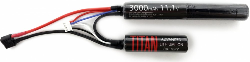 Jediné airsoftové baterie vyrobené v USA s jednoroční zárukou. Baterie jsou vyrobeny z kvalitních článků s vysokou energetickou hustotou. Mají 2-5x větší kapacitu a jsou schopny dodávat až 2x větší proud než běžné airsoftové baterie. I po 300 cyklech si zachovají 80% své původní původní kapacity. Nikdy se nestane, že by se nafoukly tak jako se to stává u Li-Pol baterií. TITAN si za svými bateriemi...