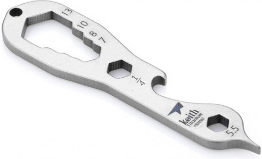 Praktická titanový multitool Keith, která může posloužit jako klíčenka obsahuje šesti velikosti klíčů (1/4" - 5,5 - 7 - 8 - 10 - 13), šroubovák, otvírák na láhve a dírka pro kroužek na zavěšení