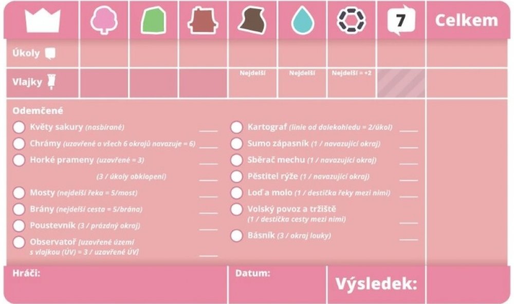Stíratelný bodovací list pro hru Dorfromantik: Sakura pro zapisování fixou je možné používat opakovaně. Nahrazuje jednorázové listy bodovacího bločku.