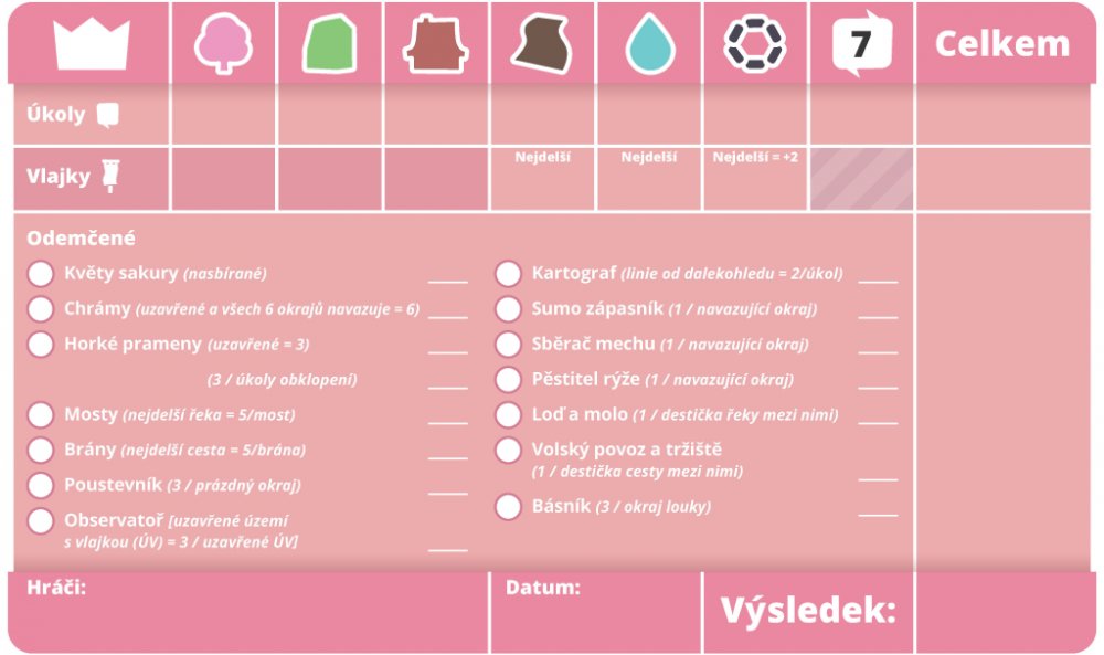 Stíratelný bodovací list pro hru Dorfromantik: Sakura pro zapisování fixou je možné používat opakovaně. Nahrazuje jednorázové listy bodovacího bločku.