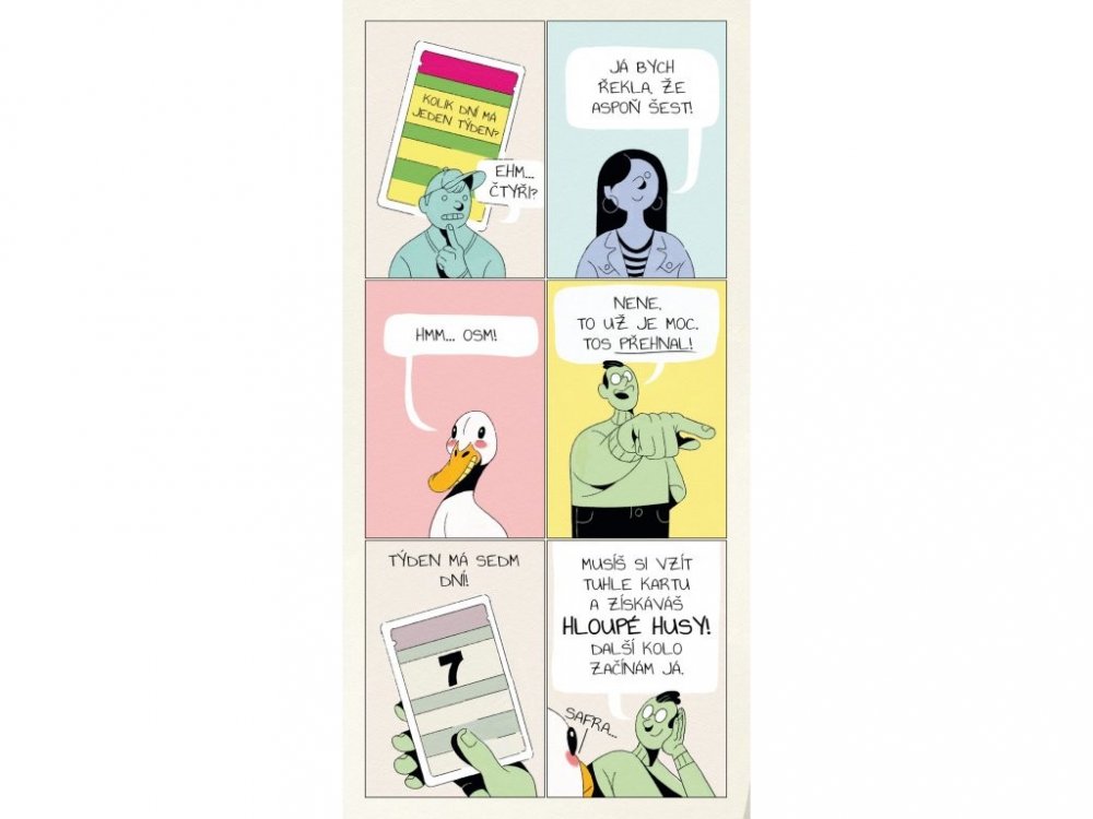Průběh hry: Jeden hráč přečte otázku (správná odpověď je vždy číslo). Aktivní hráč musí říct číslo, které se blíží správné odpovědi, ale není vyšší. Každý hráč musí říct vyšší číslo než ten předchozí, nebo ohlásí "Tos přehnal!", pokud se myslí, že předchozí hráč řekl vyšší číslo, než je správná odpověď. Poté se ověří správná odpověď a hráč, který se mýlil, si musí kartu ponechat. Ta vždy obsahuje určitý počet hloupých hus - záporných bodů. Jakmile hráč nasbírá určitý počet karet, hra končí a hráč s největším počtem bodů za hloupé husy prohrává. Všichni ostatní vyhrávají.