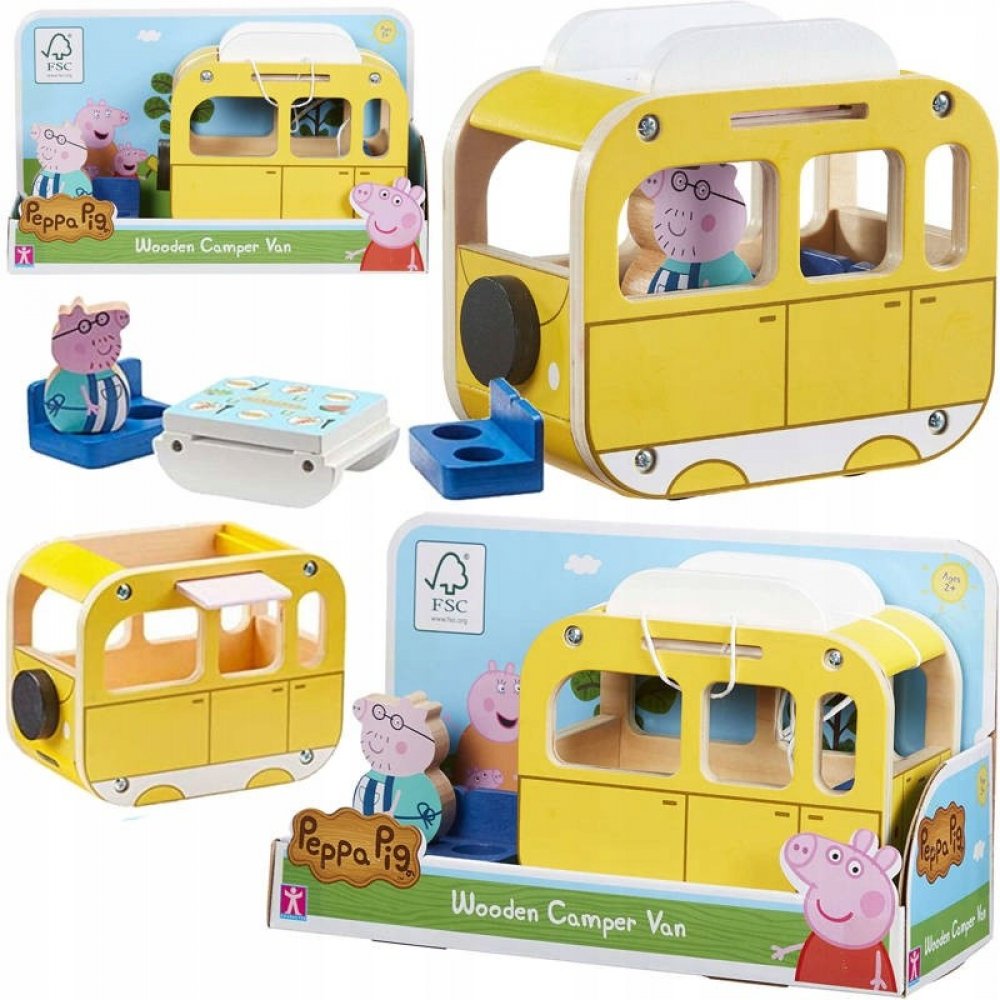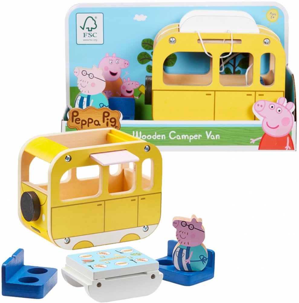 Podrobnosti o produktu PEP07388 Dřevěný karavan Peppa obsahuje doplňky s dvojitou funkcí: zatahovací markýza se změní na piknikovou rohož, odnímatelná střecha na piknikový stůl. Součástí karavanu jsou také odnímatelná sedadla a zatahovací mřížka. Obsahuje dřevěnou figurku tatínka. Vyrobeno z ekologického FSC dřeva.