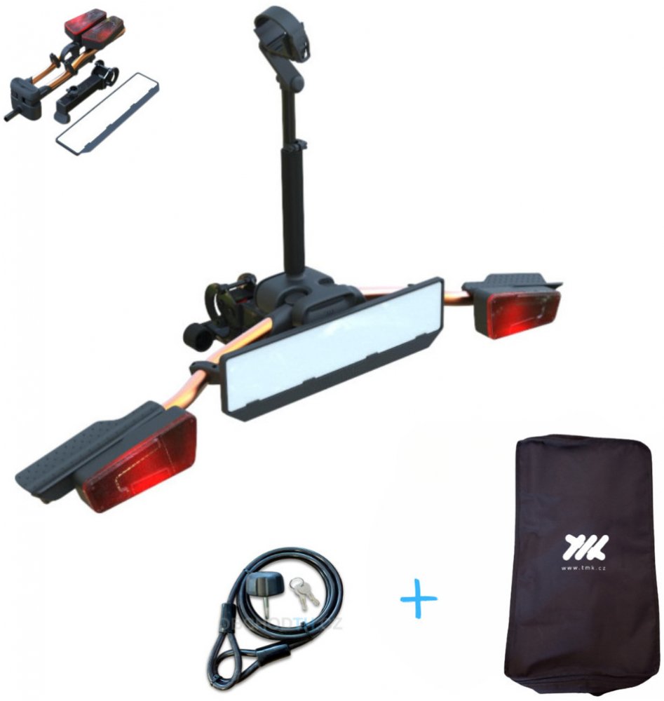 Součástí balení nosiče je zamykací systém, sada pro posunutí ráfků kol, podložka pod SPZ, 13 pin zástrčka a návod.