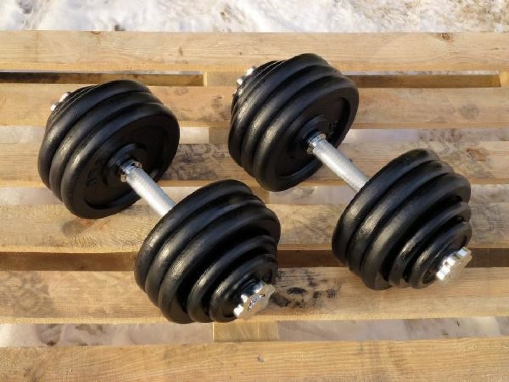 Sada jednoručních činek o celkové váze 2x40kg (každá závaží 6x5kg+2x2,5kg+2x1,25kg), chromové ocelové osy (váha hřídelí 2x2,5kg). Jedná se o nakládací činky, kotouče je možné libovolně přendavat, ubírat nebo přidávat.