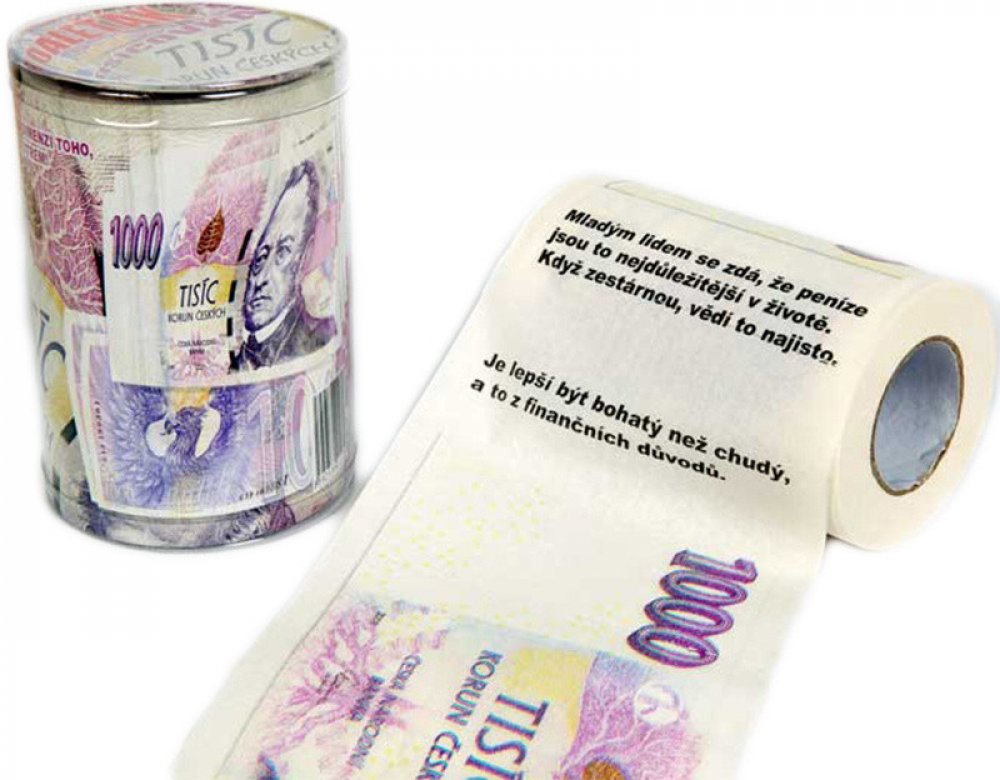 Máte rádi tvrdou českou měnu a nejraději sbíráte bankovky? Tak právě tento toaletní papír je pro Vás ten pravý. Toaletní papír je potištěn 1000,- Kč bankovkami a na Vašem záchodě se bude opravdu vyjímat.