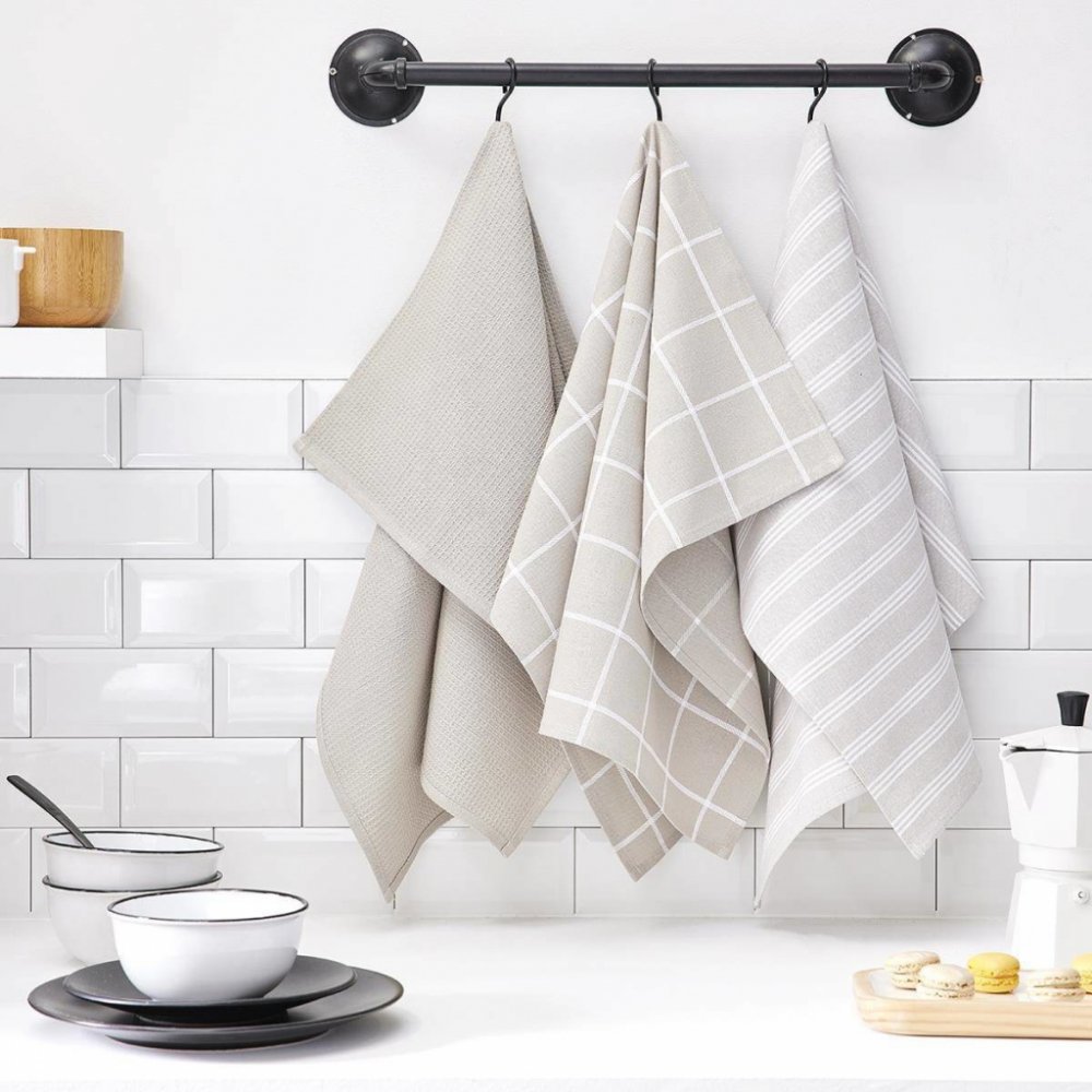 Kuchyňské utěrky - záruka čisté pracovní desky a dobře vykynutého kynutého těsta. Látky jsou vyrobeny z bavlny. Přírodní materiál je příjemný na dotek. Nedráždí. Je také vysoce absorpční. Robustní tkanina má hmotnost 185 GSM: Taková vazba je dostatečná, aby si utěrky poradily s rozlitou vodou, skvrnami od jídla a dalšími nečistotami. Utěrky jsou alternativou k papírovým ručníkům. Šetřete peníze a pečujte o planetu. S kuchyňskými utěrkami Uni snížíte množství odpadků. Sada tří utěrek v béžové barvě. Každá tkanina má trochu jiný design, takže nuda nehrozí. Látky mají rozměry 50 x 70 cm. Praktická velikost se skvěle hodí při úklidu kuchyně nebo utírání pracovních desek. Čistou utěrku můžete použít také jako kryt mísy.