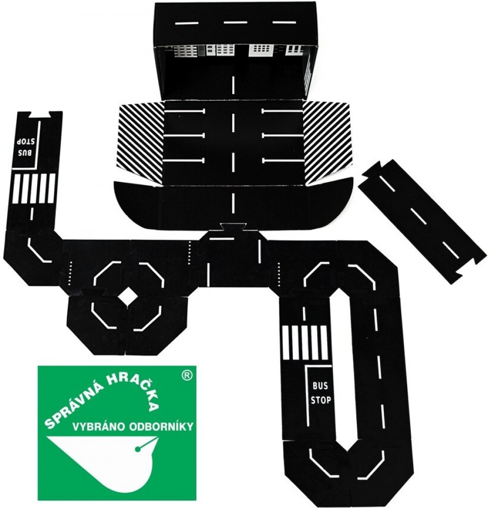 • 14 silikonových oboustranných prvků: 4x křižovatka, 6x zatáčka, 4x rovinka včetně 2 autobusových zastávek a přechodů pro chodce