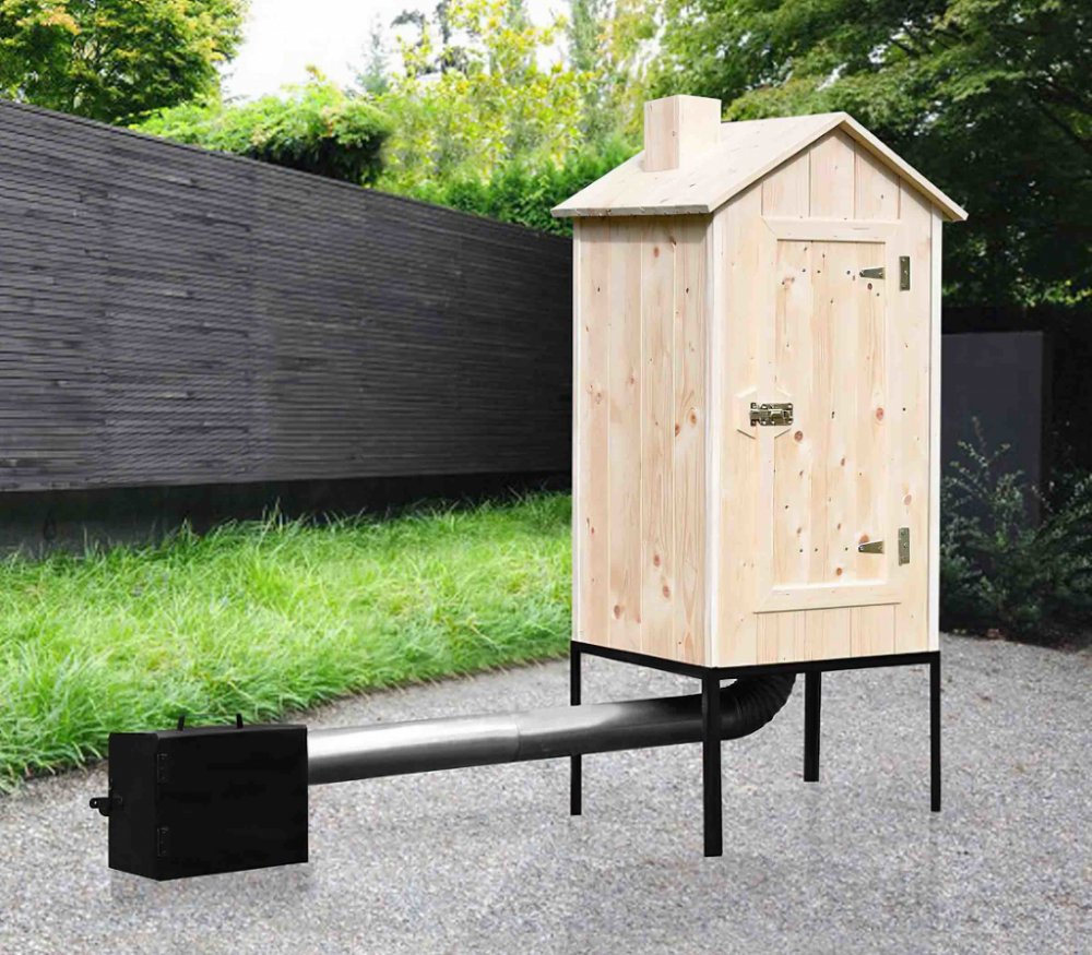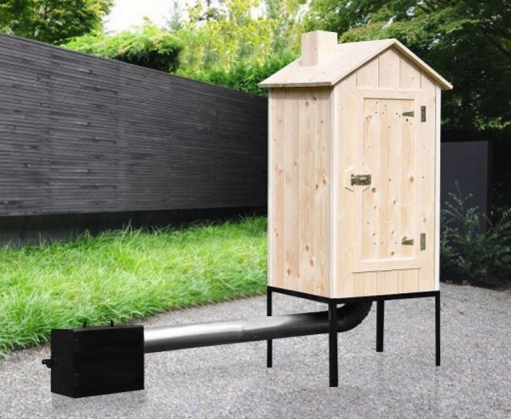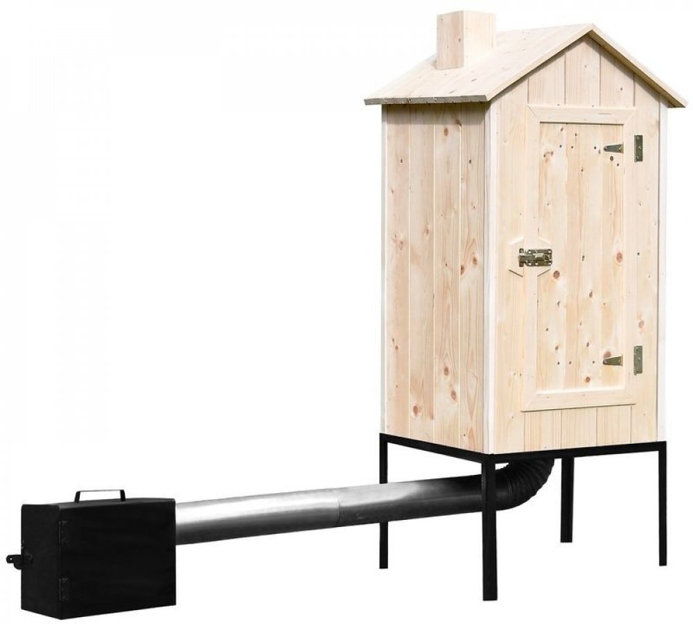 - zahradní venkovní udírna dřevěná ze smrkových palubek 19 mm silných. Uvnitř udírny jsou dřevěné podpěry na zavěšení masa.