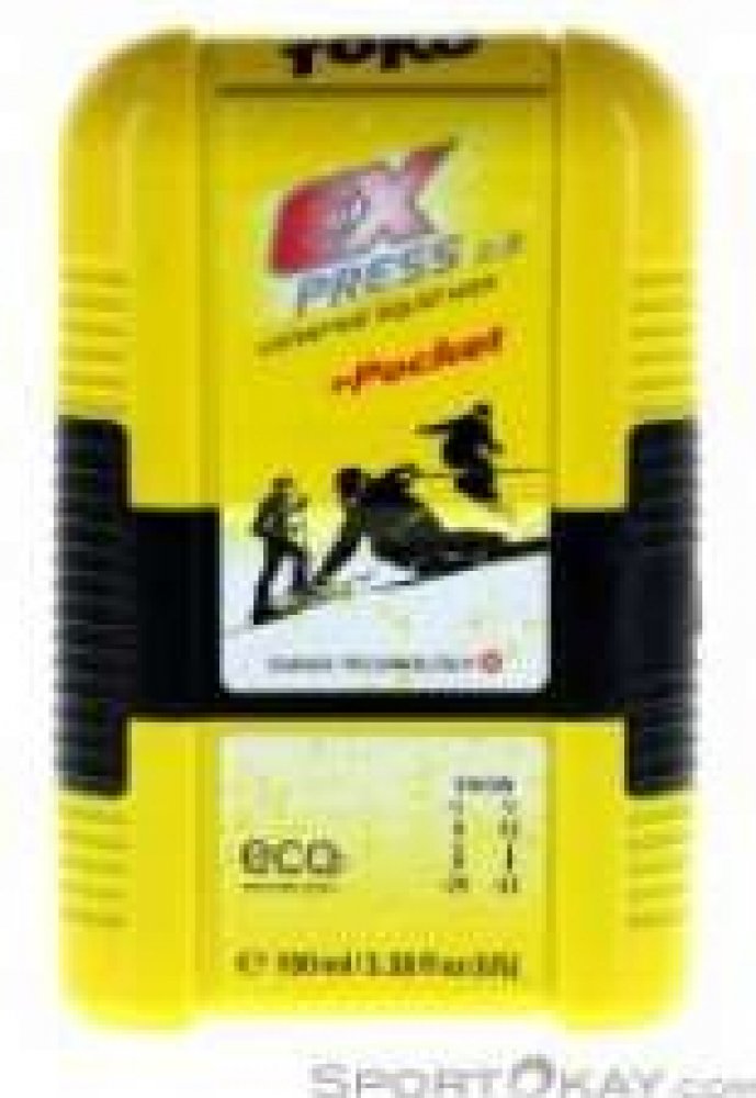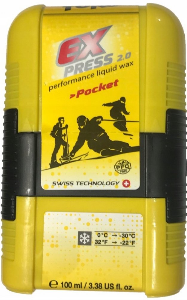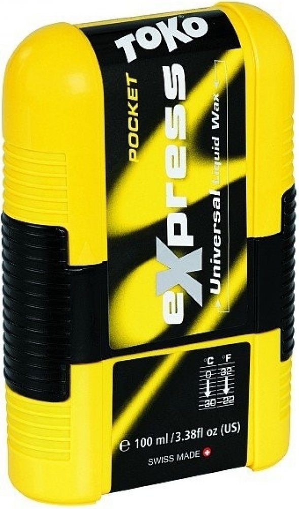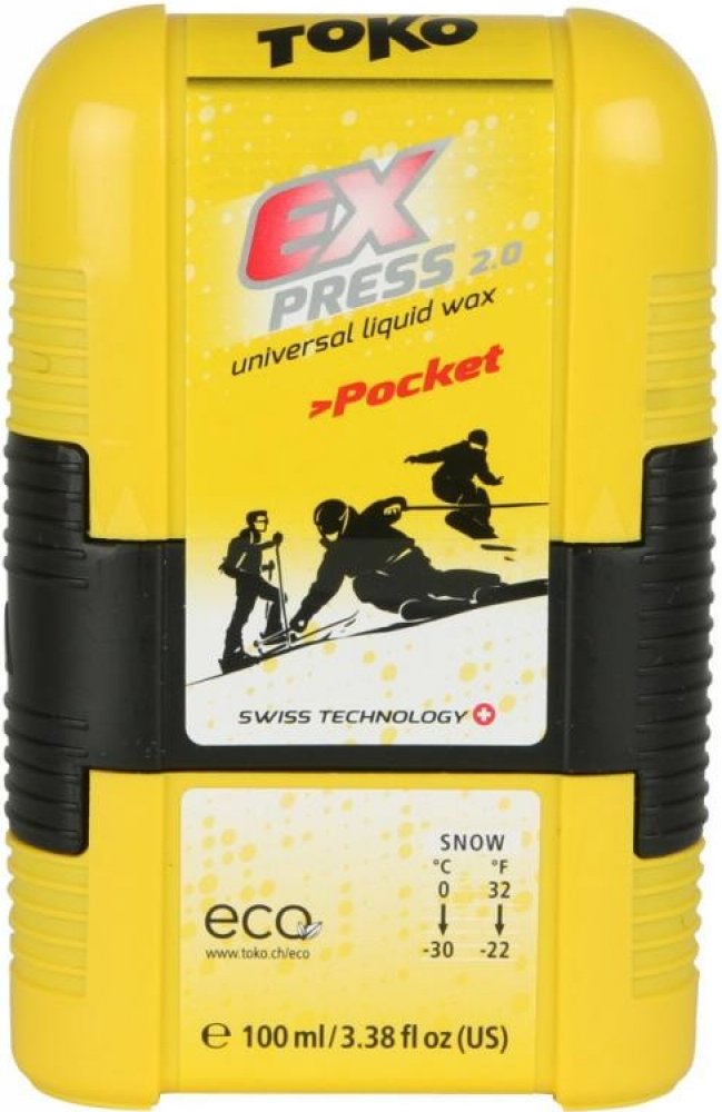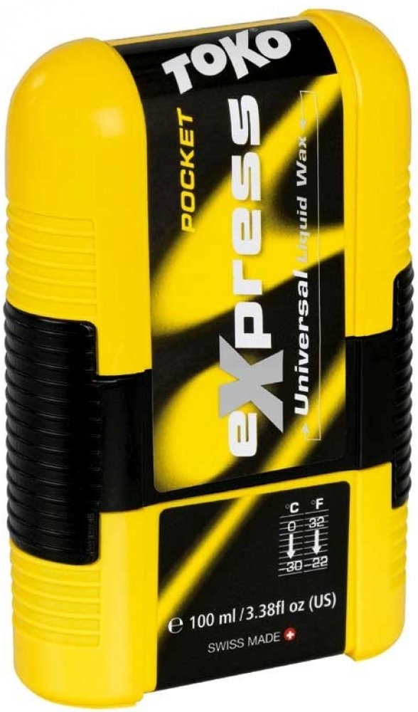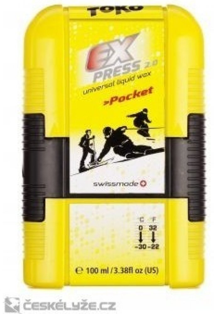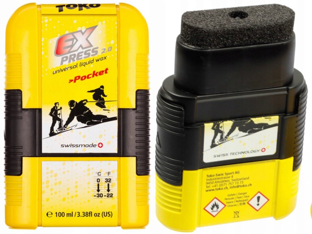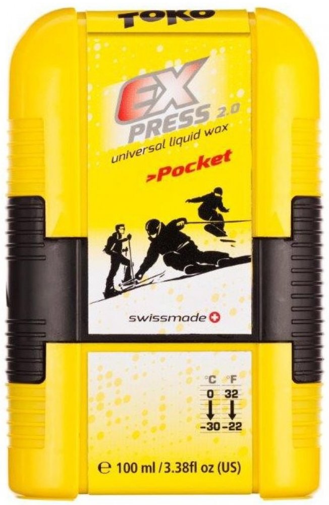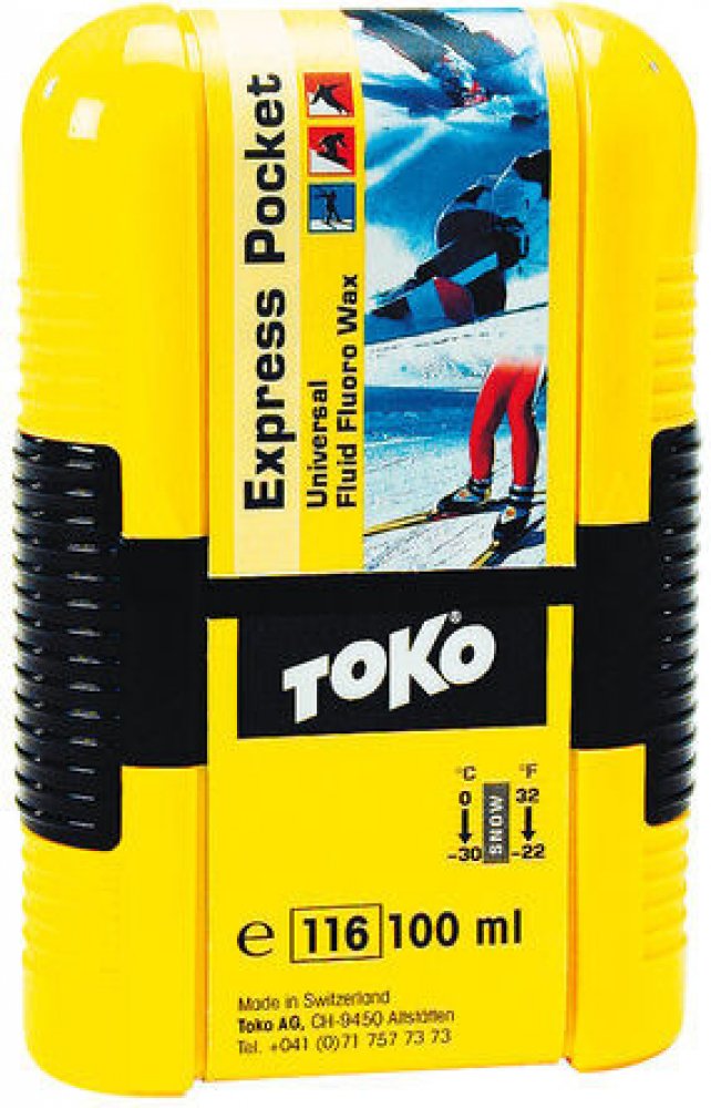 Vosk Toko Express Pocket - je tekutý lyžařský vosk bez obsahu fluoru o objemu 100 ml. Je vhodný pro sněhové podmínky v teplotním rozmezí 0 °C až -30 °C. Je určený pro rekreační nebo turistické použití. Vezmete si ho do kapsy a v případě náhlé změny počasí rychle přemažete. Houbička je součástí. Jeho nevýhodou je nižší životnost nežli klasické pevné lyžařské vosky, vydrží tak 1-1,5 hodiny.