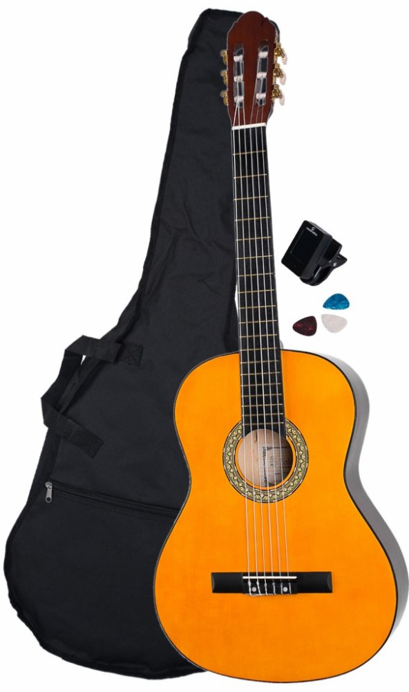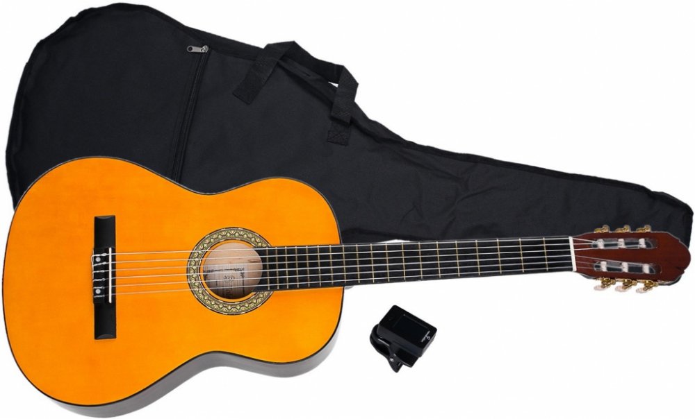 Klasická kytara Cenově dostupná kytarová sada pro začínající hudebníky obsahuje vše, co budete během vašich prvních krůčků potřebovat. V balení najdete klasickou kytaru velikosti 4/4 osazenou nylonovými strunami, klipovou ladičku pro snadné a rychlé naladění, trsátka a pouzdro s přední kapsou na příslušenství.