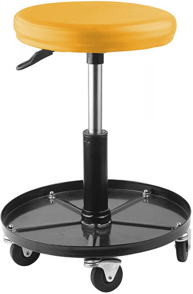 Nosnost 150 kg; polstrované sedadlo; 5 koleček Ø 62,3 × 18 mm pro snadné pojíždění; snadno nastavitelná výška (v rozmezí 120 mm); praktický zásobník pro odkládání nástrojů. Sedák Ø 310 x 40 mm, základna Ø 385 x 23 mm, otvor pro píst Ø 49 x 50 mm. Výška nastavitelná 370 - 490 mm.