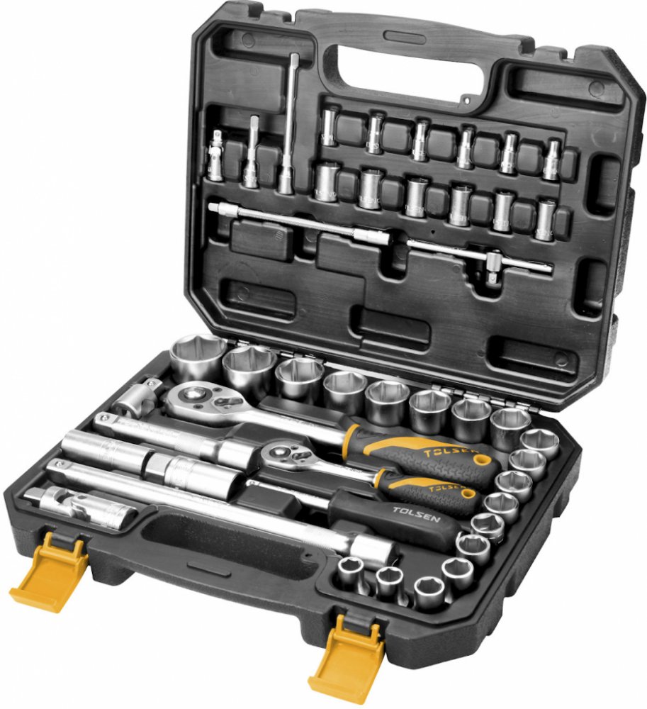 Obsah sady: 18 ks 1/2" nástrčné klíče 10; 11; 12; 13; 14; 15; 16; 17; 18; 19; 20; 21; 22; 23; 24; 27; 30 a 32 mm. 2 ks rychloupínací ráčny 1/2" a 1/4". 1 ks 1/2" kardanový kloub. 2 ks prodlužovací nástavec 1/2", délky 125 a 250 mm. 1 ks 1/2" třícestný adaptér. 2 ks klíč na svíčku 16 a 21 mm. 12 ks nástrčné klíče 4; 5; 5,5; 6; 7; 8; 9; 10; 11; 12; 13 a 14 mm. 1ks 1/4" kardanový kloub. 2 ks prodlužovací nástavec 1/4", délky 50 a 100 mm.1 ks posuvný 1/4" "T" kus, délky 115 mm. 1 ks flexibilního nástavce, délky 150 mm. 1 ks 1/4" rukojeť 150 mm. Dodáváno v plastovém boxu.