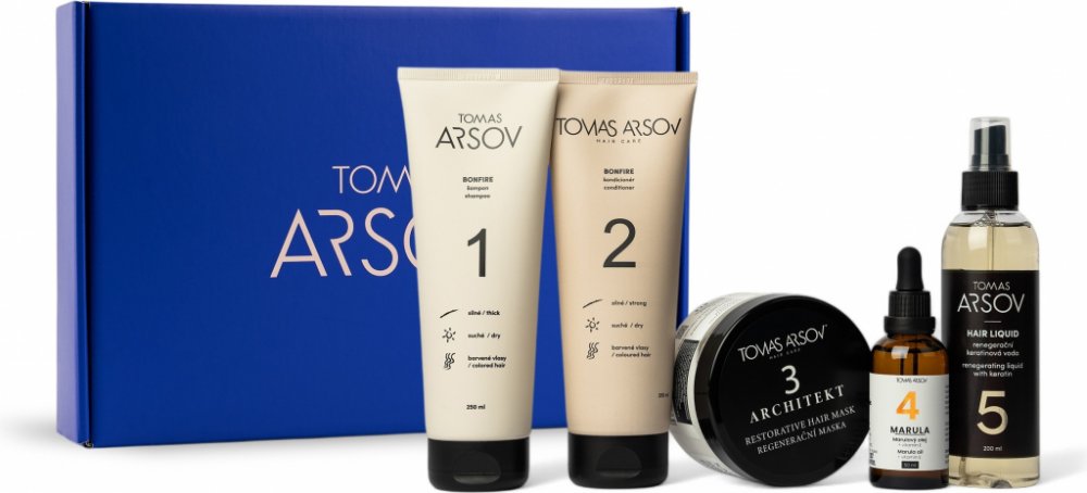 Tomas Arsov Péče o poškozené vlasy BONFIRE Šampon 250 ml + Oplachový kondicionér 250 ml +ARCHITEKT maska 250 ml + Marulový olej s vitamínem E 50 ml + HAIR LIQUID Keratin. voda 200 ml dárková sada