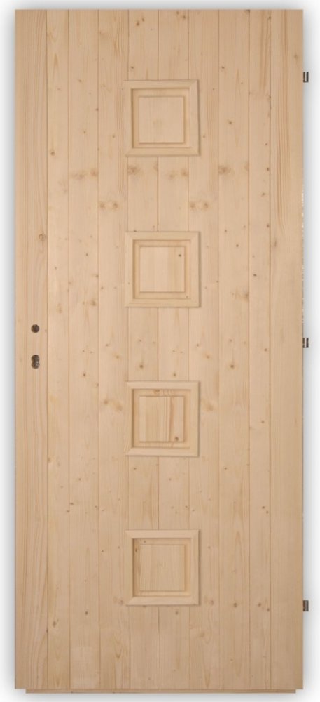 Vchodové palubkové dveře Quatro plné se čtyřmi kazetami 20 x 20 cm jsou mladší alternativou této řady. Jedná se o dveře typické šíře 60, 70, 80 a 90, výše 198,5 cm a tloušťky 45 mm. Jsou zatepleny 2 cm polystyrenem a osazeny z obou stran palubkami 92 x 12 mm. Rozměry polodrážky činí 25 x 15 mm. Standardně jsou připraveny pro zámek FAB 60/90 mm a k osazení do dřevěných i ocelových zárubní. Dveře js...