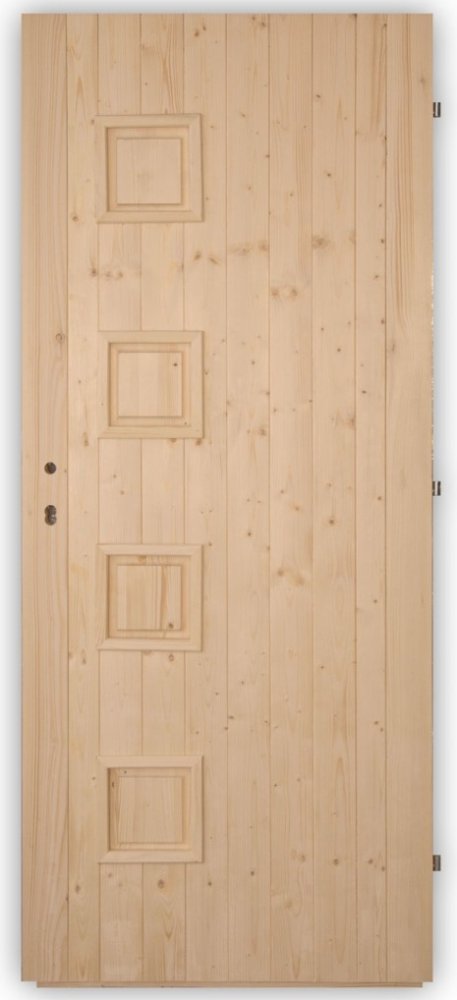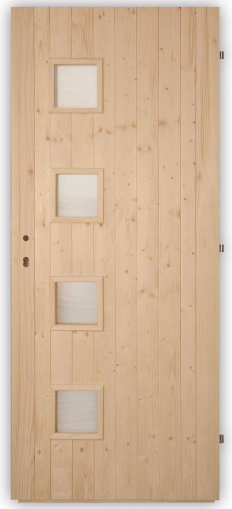 Vchodové palubkové dveře Quatro plné se čtyřmi kazetami 20 x 20 cm jsou mladší alternativou této řady. Jedná se o dveře typické šíře 60, 70, 80 a 90, výše 198,5 cm a tloušťky 45 mm. Jsou zatepleny 2 cm polystyrenem a osazeny z obou stran palubkami 92 x 12 mm. Rozměry polodrážky činí 25 x 15 mm. Standardně jsou připraveny pro zámek FAB 60/90 mm a k osazení do dřevěných i ocelových zárubní. Dveře js...