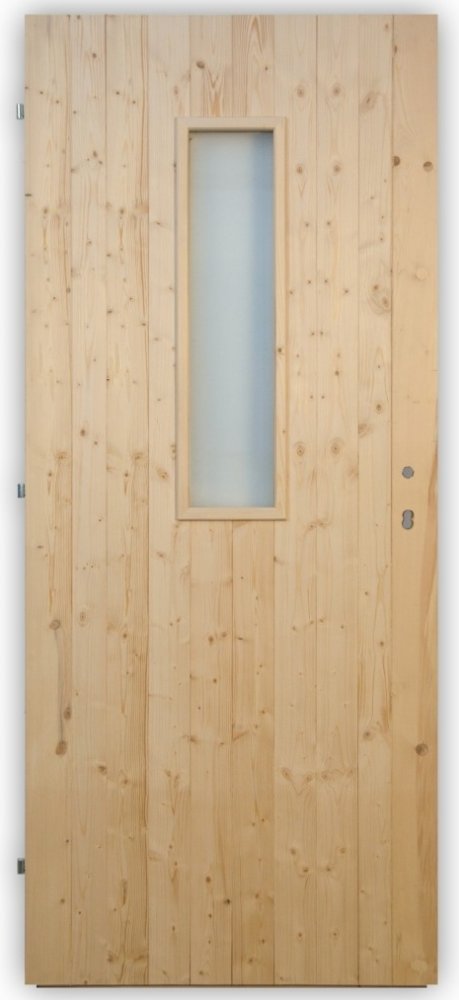 Vchodové palubkové dveře Vista s izolačním dvojsklem 20 x 72 cm vzoru Kůra jsou základním typem prosklených dveří našeho sortimentu. Jedná se o dveře typické šíře 60, 70, 80 a 90, výše 198,5 cm a tloušťky 45 mm. Jsou zatepleny 2 cm polystyrenem a osazeny z obou stran palubkami 92 x 12 mm. Rozměry polodrážky činí 25 x 15 mm. Standardně jsou připraveny pro zámek FAB 60/90 mm a k osazení do dřevěných i ocelových zárubní. Dveře jsou bez povrchové úpravy.