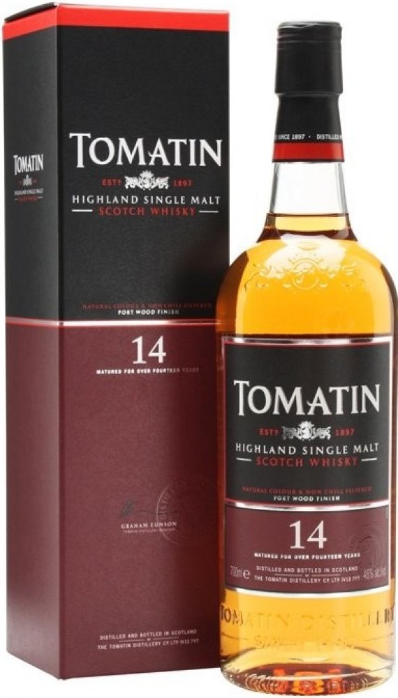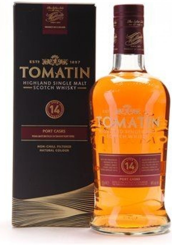 Tomatin 14 letá whisky je jemná,hladká a těží ze svého času stráveného v Tawny Port sudech. Bohaté ,ale vyvážené aroma červených bobulí, medu a karamelu.