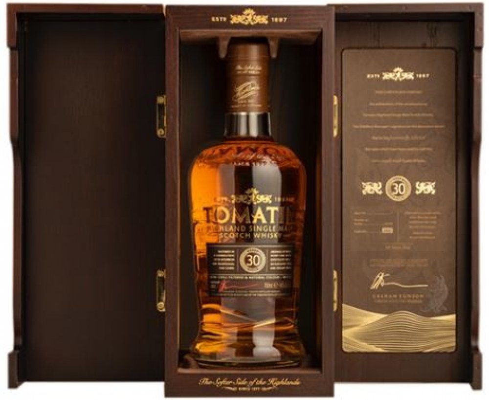 Tomatin 30yo je ultra-prémiová skotská single malt whisky. Název dává tušit, že strávila plných 30 let v sudech po bourbonu. Ve vůni nás uvítá zralé ovoce, med a bílá čokoláda, v chuti najdeme tóny tropického ovoce, vanilkového krému a vzácného koření. Závěr je dlouhý, komplexní a elegantní. Tomatin 30yo je skutečně vzácná whisky se zajímavým investičním a sběratelským potenciálem.