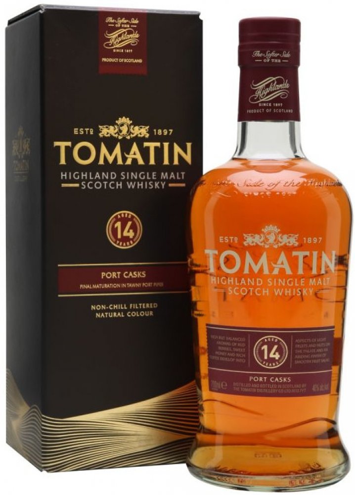 Úžasná 14 let stará single malt whisky značky Tomatin. Zrání probíhalo v sudech, ve kterých dříve zrálo po dobu 50 let portské. Komplexní aroma přináší bohatou a vyváženou vůní červených bobulí, sladkého medu a karamelek, které prostupují do tónů lehkého ovoce a ořechů.