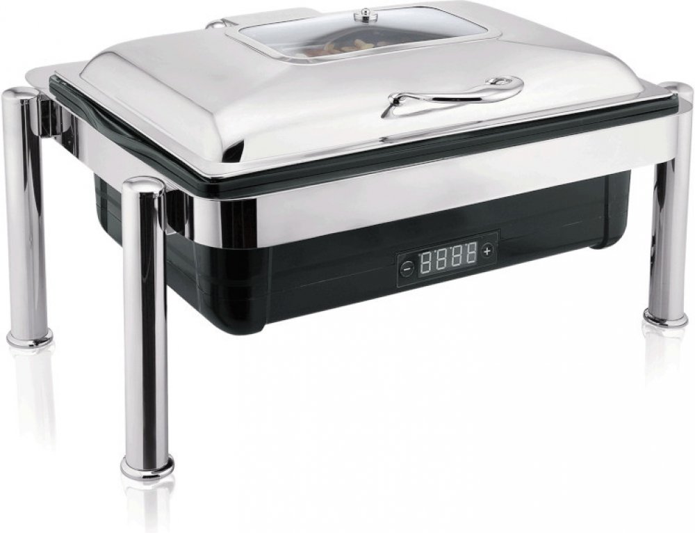 TOMGAST Chafing elektrický s diplejemElektrický chafing s regulačním termostatem pro gastronádobu GN 1/1 (65 mm) se skvěle hodí pro podávání různých snídaňových rautů či jinde, kde je třeba jídlo teplé. Digitální displej poskytuje předvolbu teploty mezi 20 °C a 85 °C. Výklopné víko z nerezové oceli s okýnkem umožňuje vidět stav a množství podávaných pokrmů