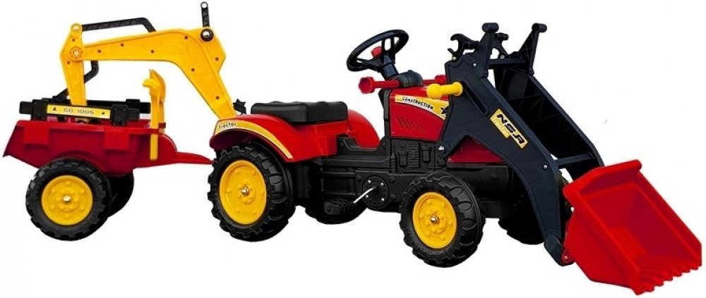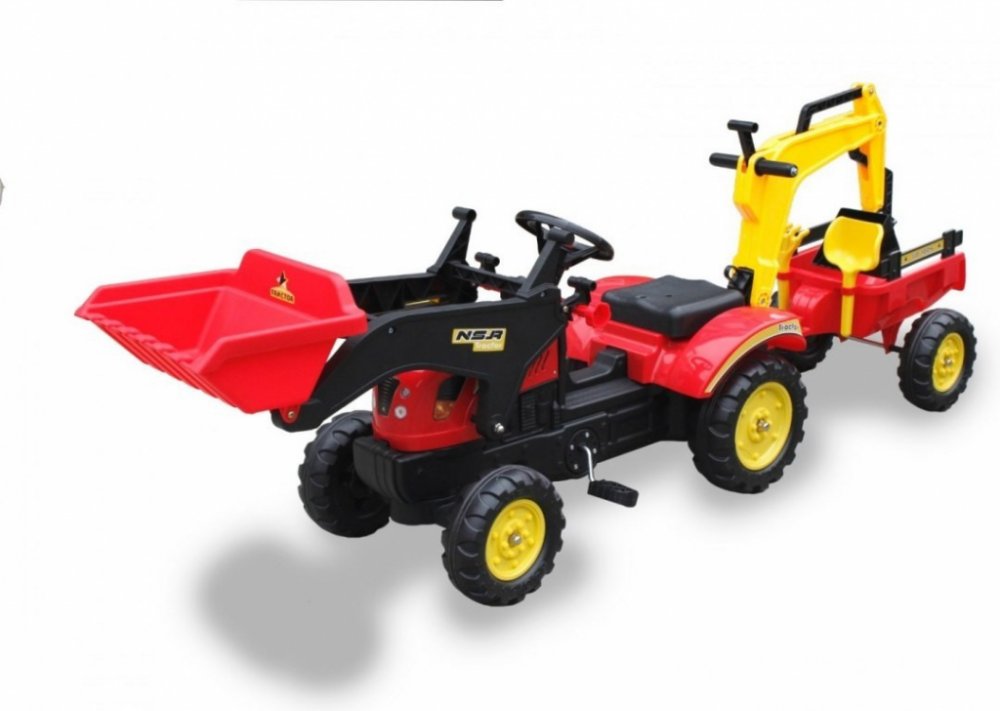 Gokart Traktor/bagr s přívěsem a příslušenstvím na pedály. Součástí je i příslušenství - lopata a hrábě. Kola traktoru jsou plastová.
