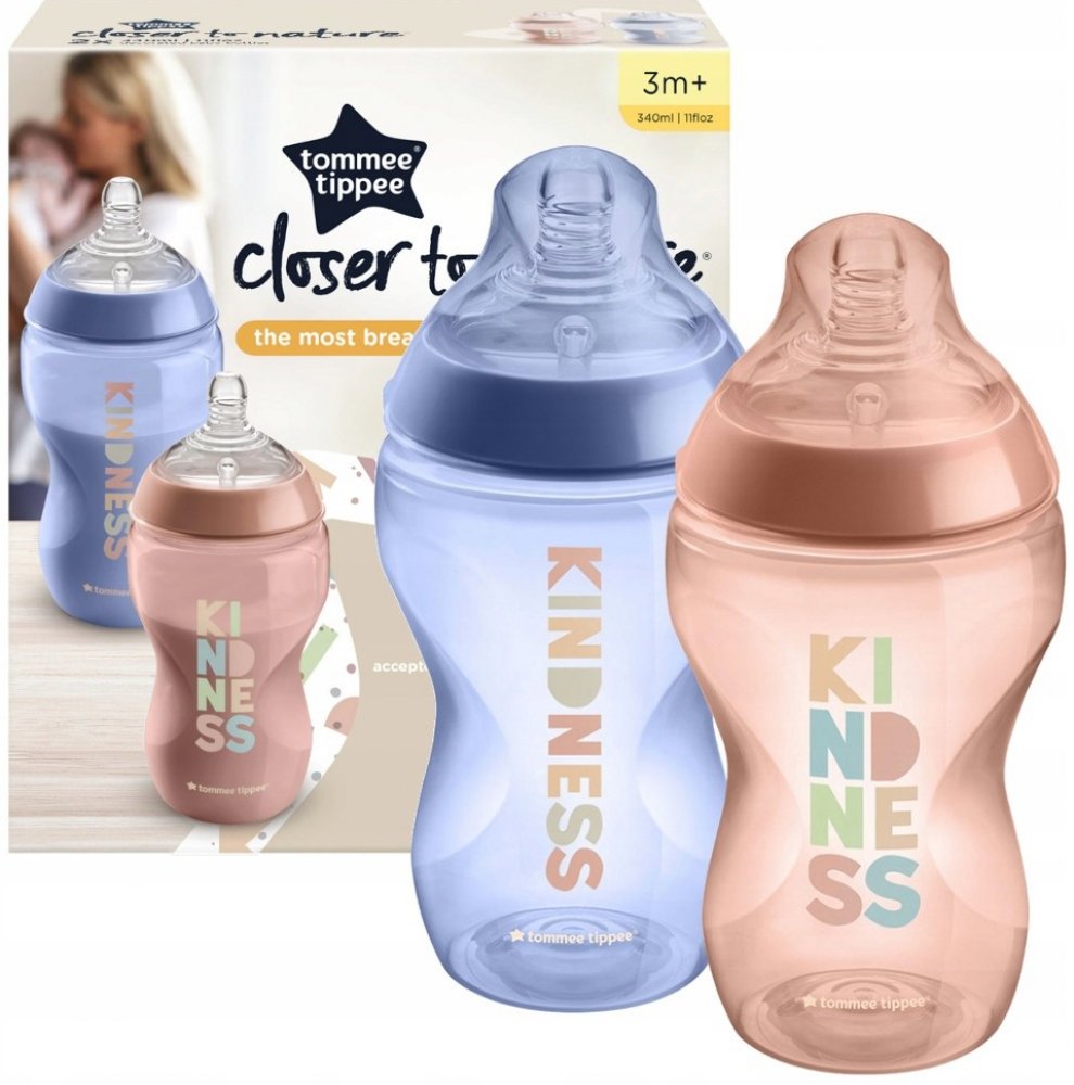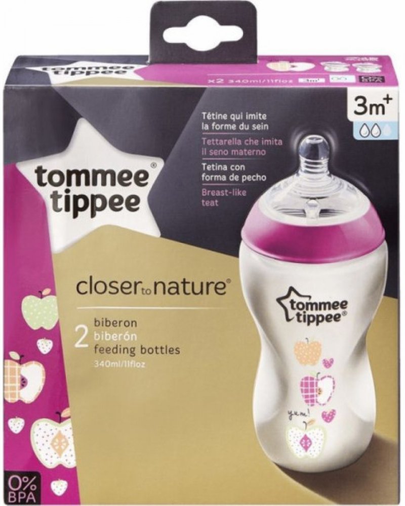 Kojenecká láhev TOMMEE TIPPEE C2N potisk 3+m 340ml, 2ks Kojenecká láhev TOMMEE TIPPEE C2N (Closer To Nature) 340ml má unikátní silikonovou savičku, která svým tvarem a vlastnostmi připomíná mateřský prs. Teplou tekutinou uvnitř lahvičky se savička zahřeje na příjemnou teplotu, měkký a pružný konec savičky připomíná mateřskou bradavku. Dítě tak téměř nepociťuje rozdíl mezi kojením a krmením z této lahvičky. V bodech: vhodné pro děti od 3 měsíců objem: 340 ml obsah balení: 2ks neobsahuje Bisfenol A unikátní silikonová savička připomínající mateřský prs dítě tak téměř nepociťuje rozdíl mezi kojením a krmením lahvičky lahvička je antikoliková, opatřená malým ventilačním otvorem na okraji savičky ventilační otvor citlivě zabezpečí únik vzduchu z láhve a tím umožní plynulé sání tekutiny a zároveň snižuje riziko břišní koliky