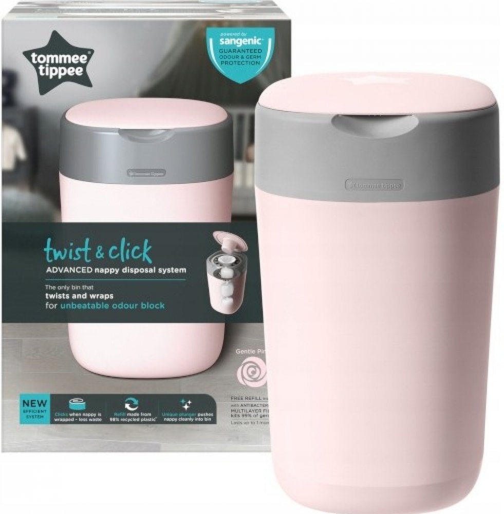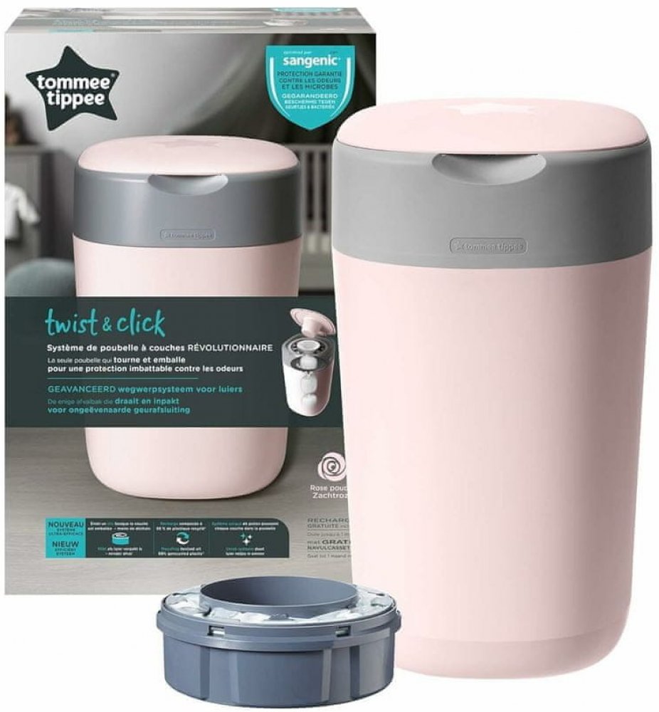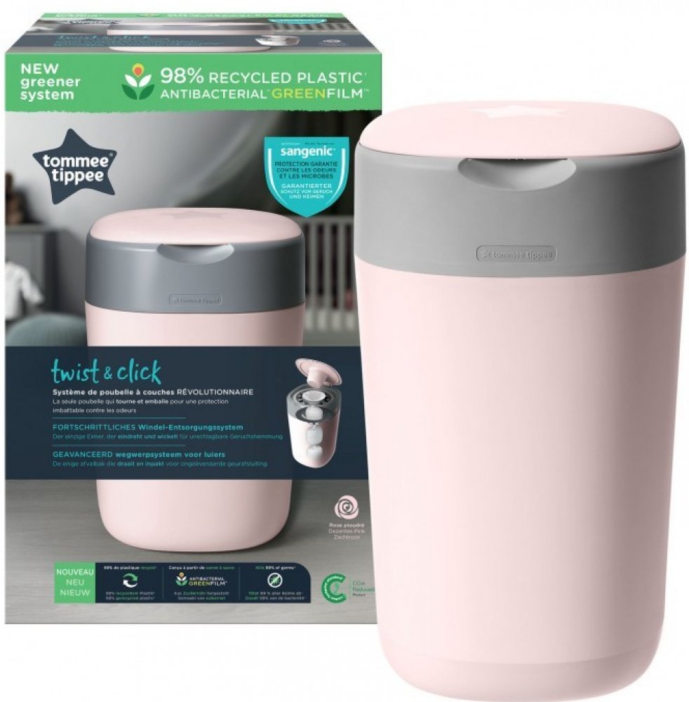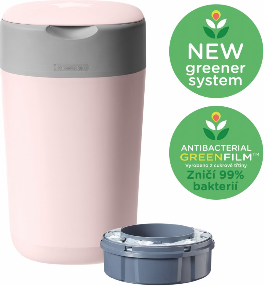 Nový, ekologičtější designový koš na jednorázové pleny Sangenic Twist & Click umožňuje bezdotykové zabalení použitých plen. Koš je vyroben z více než 98% z recyklovaného a recyklovatelného plastu. Výměnná kazeta, která je součástí koše, obsahuje 100% recyklovatelnou PE fólii GREENFILM™, vyrobenou z obnovitelného zdroje - cukrové třtiny.Nepropustná fólie GREENFILM™ ve výměnné kazetě obsahuje antibakteriální složku, která zničí 99% bakterií. Příjemná citronová vůně fólie přispívá k ochraně dětského pokoje před zápachem. Díky technologii Twist & Click se plena v koši zabalí do fólie a s pomocí pístu je zatlačena do koše. Plenu do fólie zabalíte otáčením mechanismu pod víkem, kliknutí indikuje úplné zabalení a pomáhá vám tak šetřit spotřebu fólie. Koš se stane nezbytnou součástí vaší domácnosti po celou dobu, kdy vaše dítě používá pleny. Nemusíte se obávat zápachu v místnosti, kde je koš umístěný, ani toho, že se do zkoumání použitých plen pustí vaše zvědavé batole či domácí mazlíček. Koš proto můžete mít s klidným srdcem umístěný vedle přebalovacího pultu v dětském pokoji, aby byl během přebalování vždy po ruce. V případě, že je dítě nemocné, nemusíte mít obavy z šíření bakterií z použitých plen na ostatní členy rodiny.Špičkový design koše skvěle doplní váš moderní interiér. Kapacita jedné kazety je až 84 plen (vel. 5-9 kg), při spotřebě 3 plen denně tak jedna kazeta vydrží až jeden měsíc používání.Díky tomu, že koš pojme cca 30 plen, není potřeba jej často vynášet a ušetříte tak mnoho cest k popelnici.Koš obsahuje jednu výměnnou kazetu s fólií GREENFILM™. Náhradní výměnné kazety se prodávají samostatně.Rozměry koše bez víka: Š 28 cm x H 25 cm x V 36 cm
