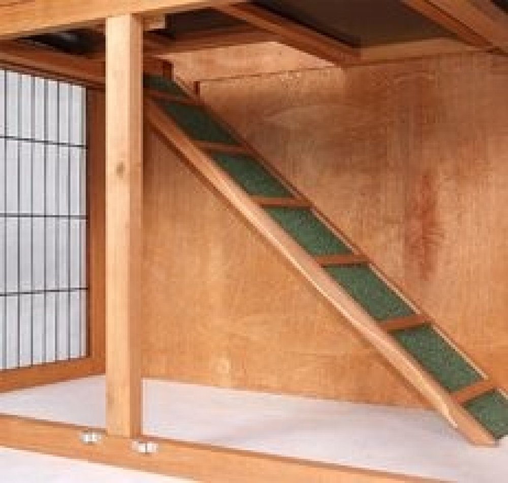 - kvalitní dvoupatrový dřevěný domeček s možností výběhu přímo na trávník