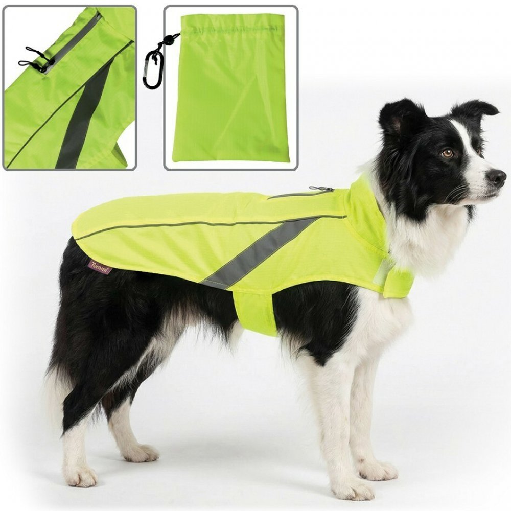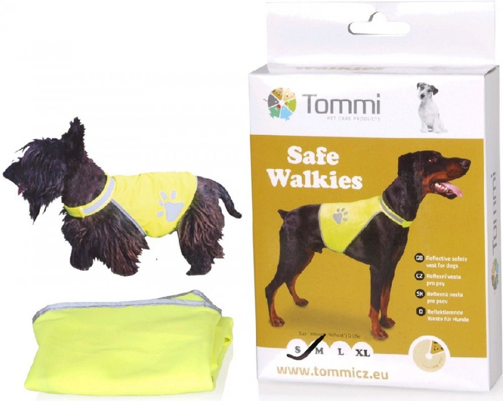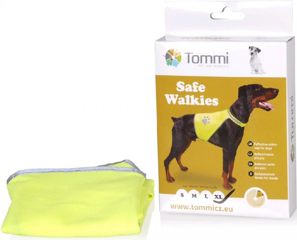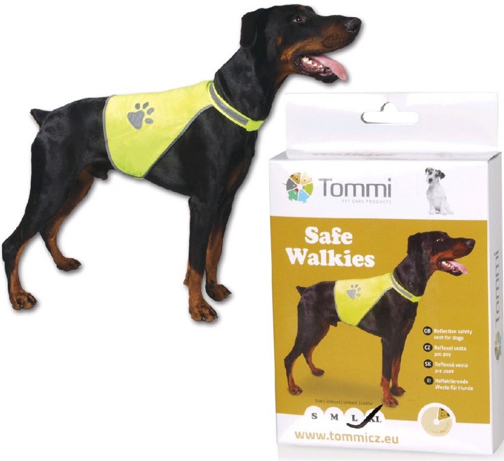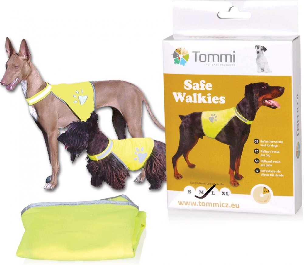Reflexní bezpečnostní vesta z voděodolného materiálu s jednoduchým zapínáním na suchý zip kolem krku a břicha. Otvor na zip pro upevnění vodítka. Kapsička, do které lze vestu složit a karabinka pro zavěšení na vodítko…Výrazné reflexní prvky při zhoršené viditelnosti / šero, mlha /.