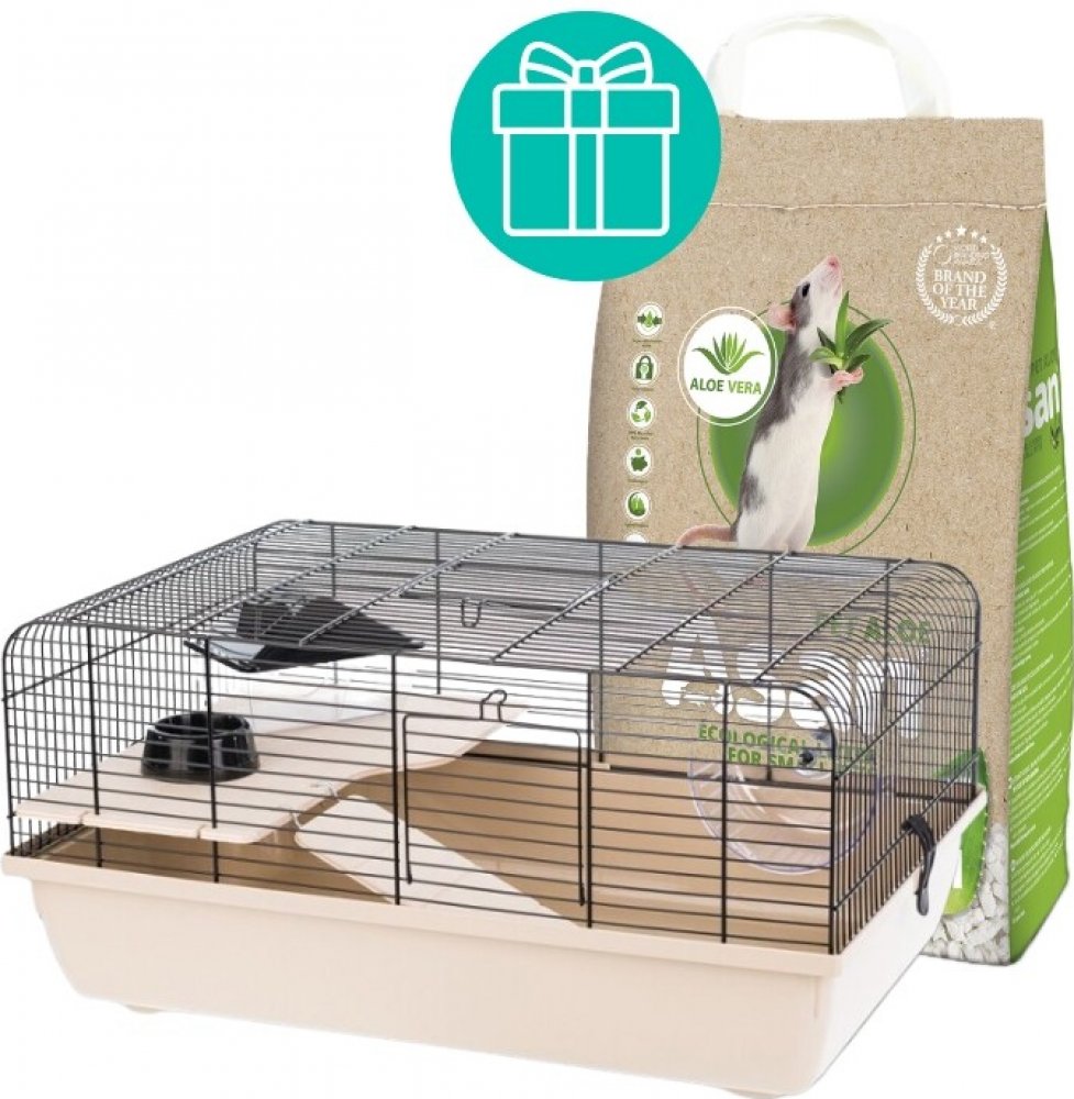 Součástí klece je dřevěné patro s rampu a plastové vybavení (domeček, kolotoč, miska).