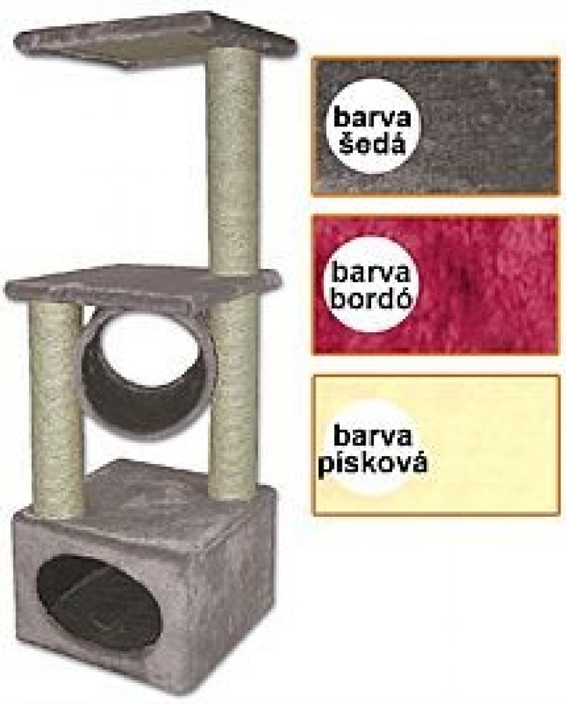 Škrabadlo Traviata pro kočky má boudičku, dvě plošinky, prolézací tunel a sisalové sloupky. Krásné a robustní škrabadlo slouží vaší kočce k odpočinku, hraní a díky plošinkám i jako pozorovatelna a pro vás se škrabadlo stane hezkým doplňkem do bytu. Ale hlavní výhoda je že v ideálním případě si kočička svou drápací vášeň vybije na škrabadle a ne na vašem nábytku. Vyrobeno z bezpečného, certifikovaného materiálu. Rozměry: 35x35x109cm. Různé barevné provedení: šedé, pískové, bordó. Pokud budete chtít určitou barvu uveďte ji prosím v objednávce, jestliže ji budeme mít skladem rádi jí vám pošlem a pokud ne, tak vás budeme informovat o aktuální nabídce barev. Obrázek je pouze ilustrační.