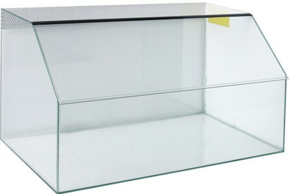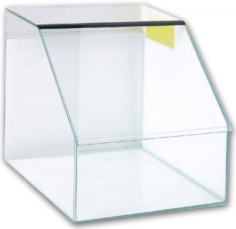 Skleněné terárium s šikmou čelní stěnou a větráním (v zádech). Ideální příbytek pro plazy a obojživelníky.